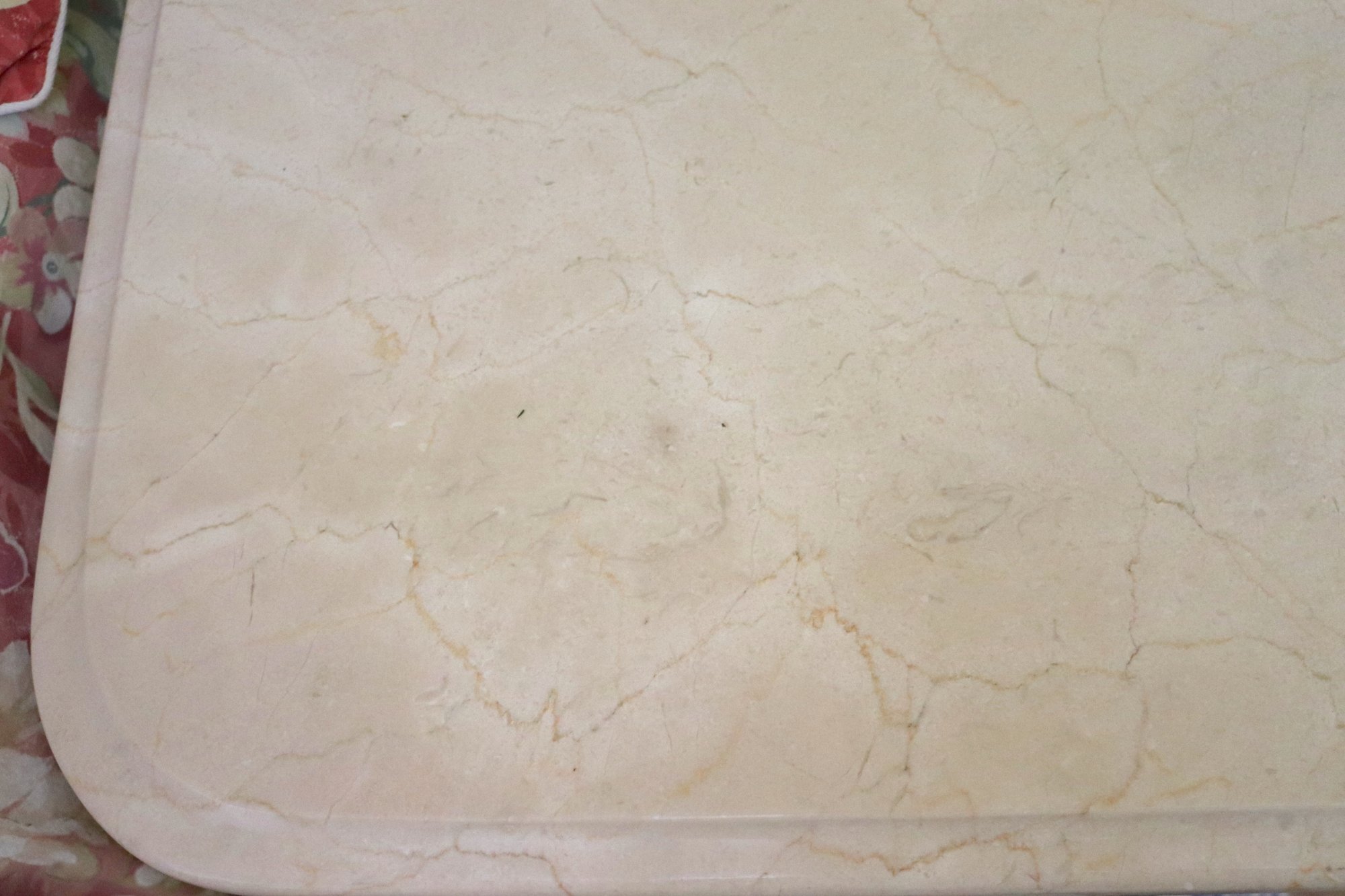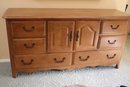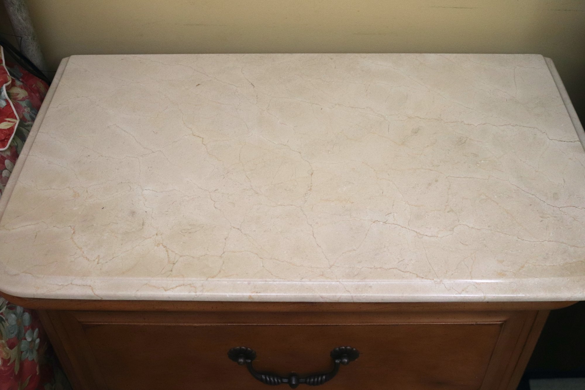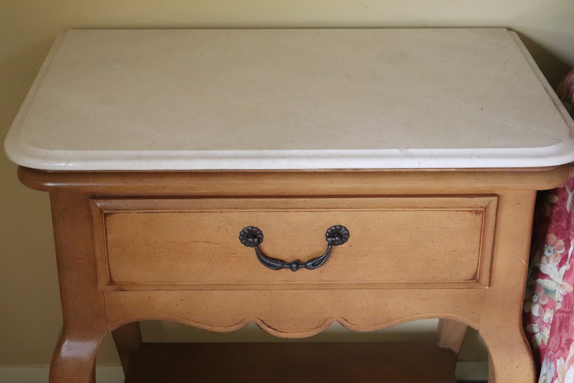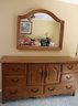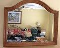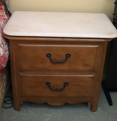 Night table & nightstand have marble tops. Night table measures 30” x 19” x 29” T, nightstand is 31” x 18.5” x 28” T. The dresser has some age-related wear to the stain on top. Please see photos for more details. Measures 71” x 20” x 36” T. Framed beveled edge mirror measures 46” x 38.”