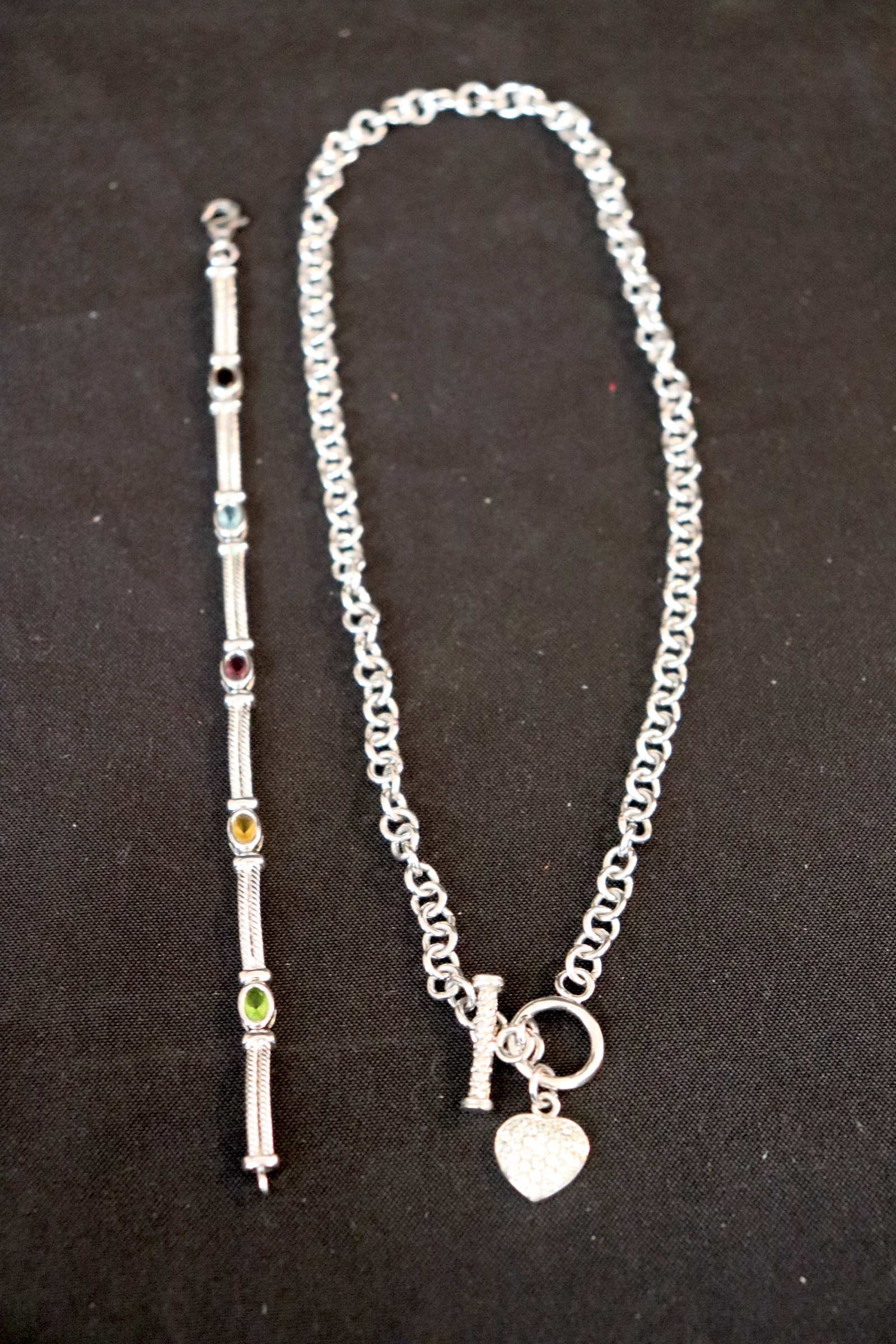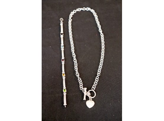 Sterling silver cable bracelet with colored topaz stones. Interior of bracelet is 2.75”, also included is a sterling silver toggle necklace, that is 9.5” L including the heart pendant.