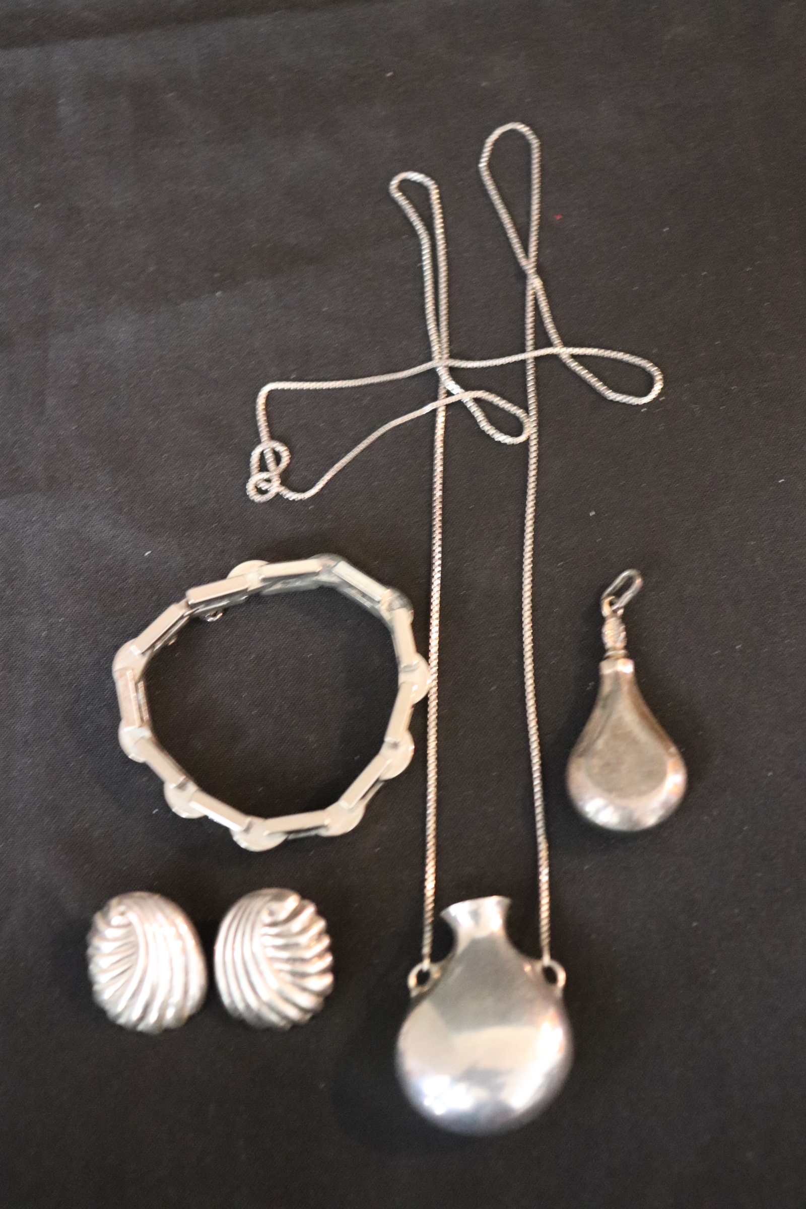 Lot includes sterling silver necklace with flask pendant, with Pr. shell shaped earrings and sterling link bracelet. Necklace is 17” L including pendant. Bracelet is 2.25” interior, Fragrance bottle is 2” L, earrings are 1” L