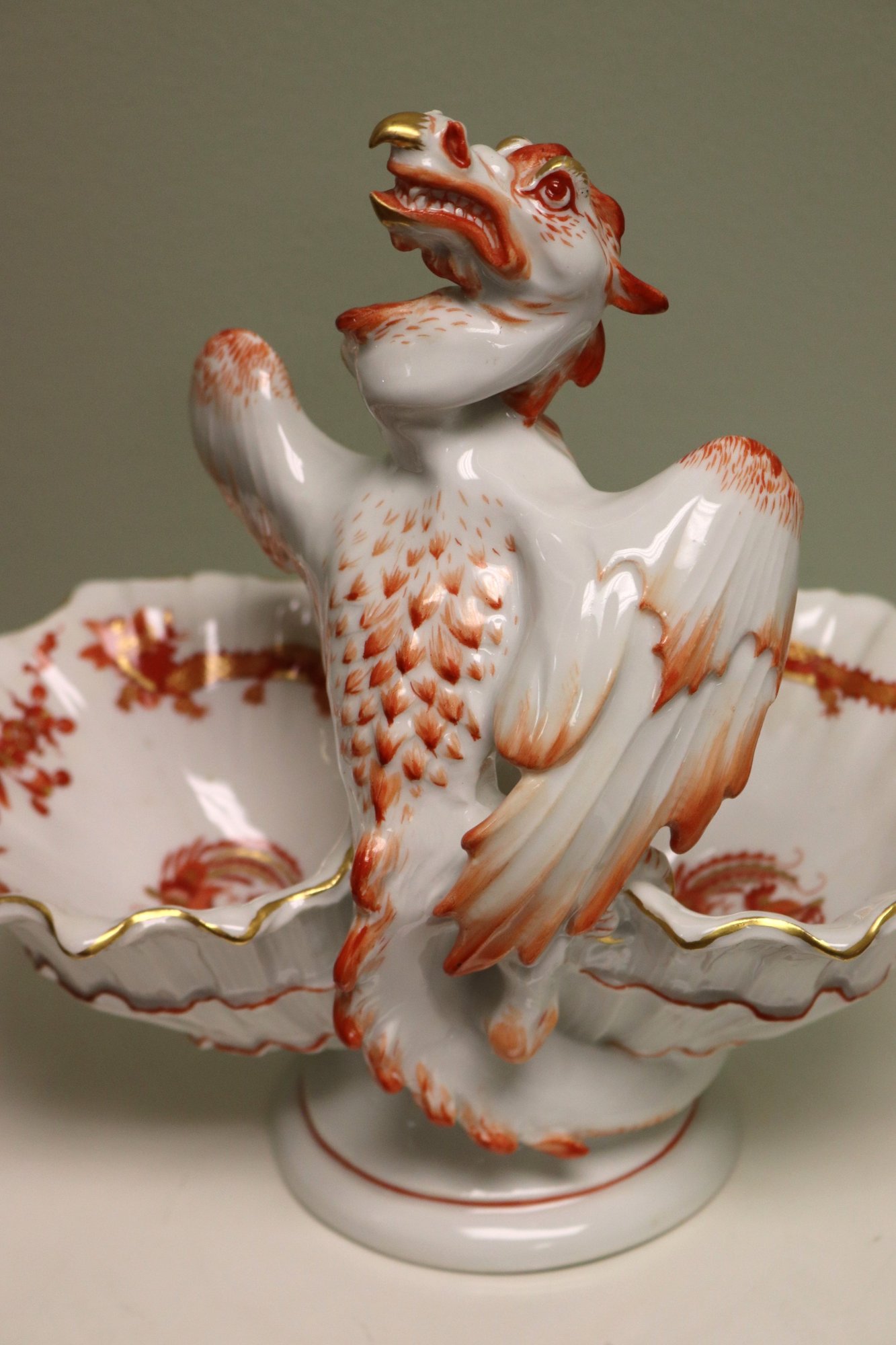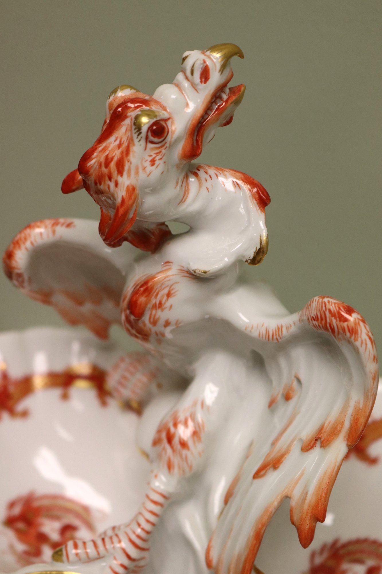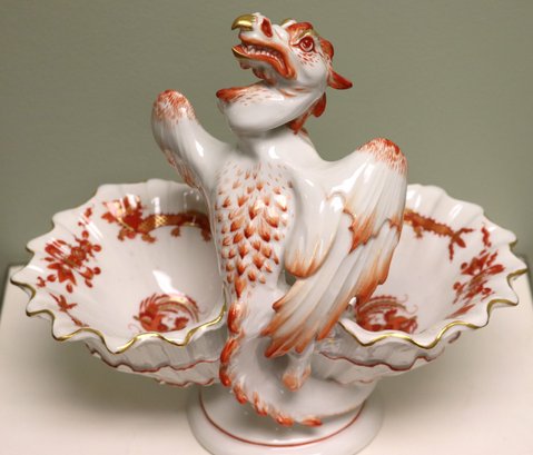 Stunning Meissen Red Ming dragon Handle double serving dish or nut dish in excellent condition. This is a rare and unique piece of Meissen featuring the red dragon design. Don’t miss this one for your collection! Measures approx. 9.5” L x 6” T
