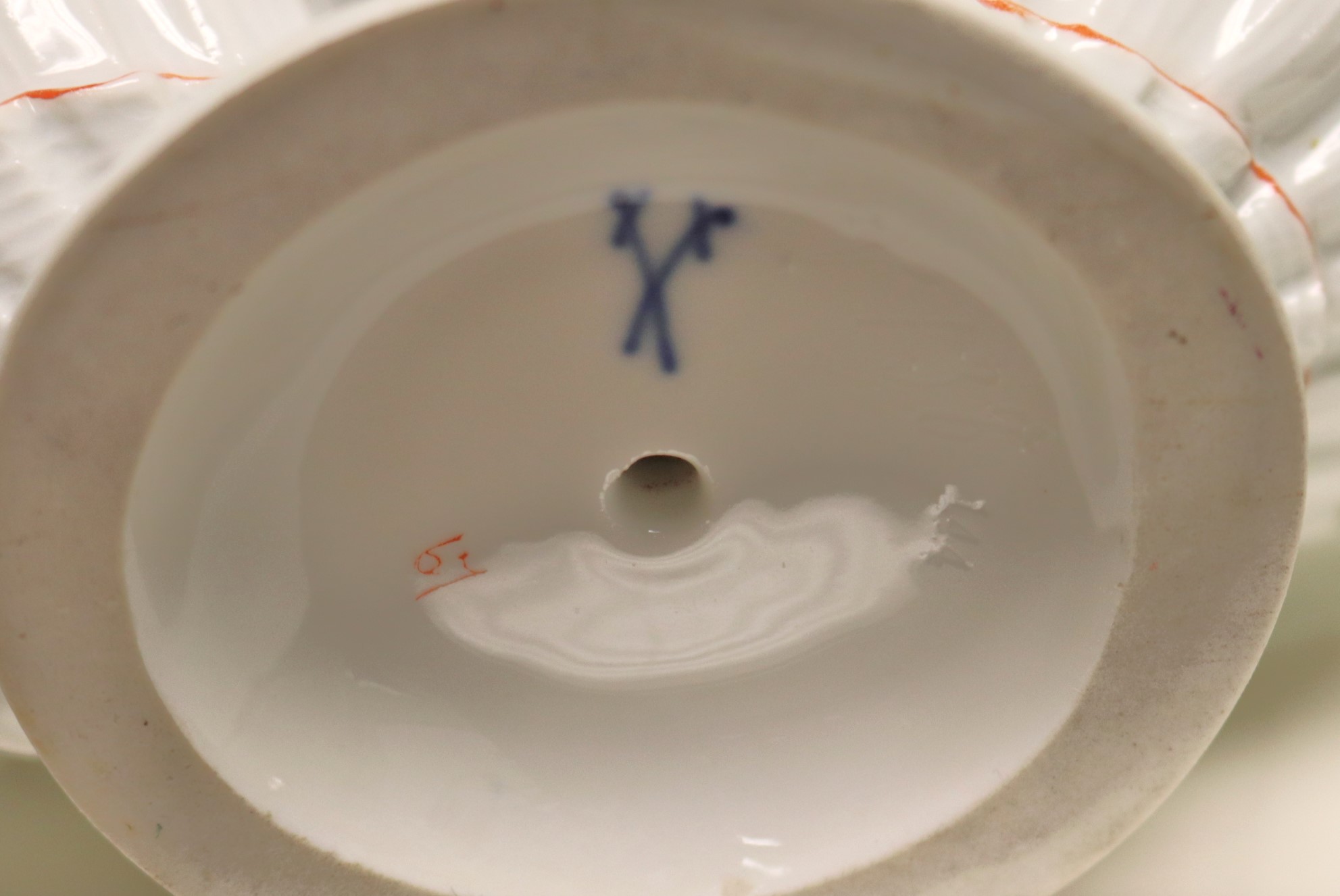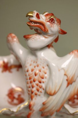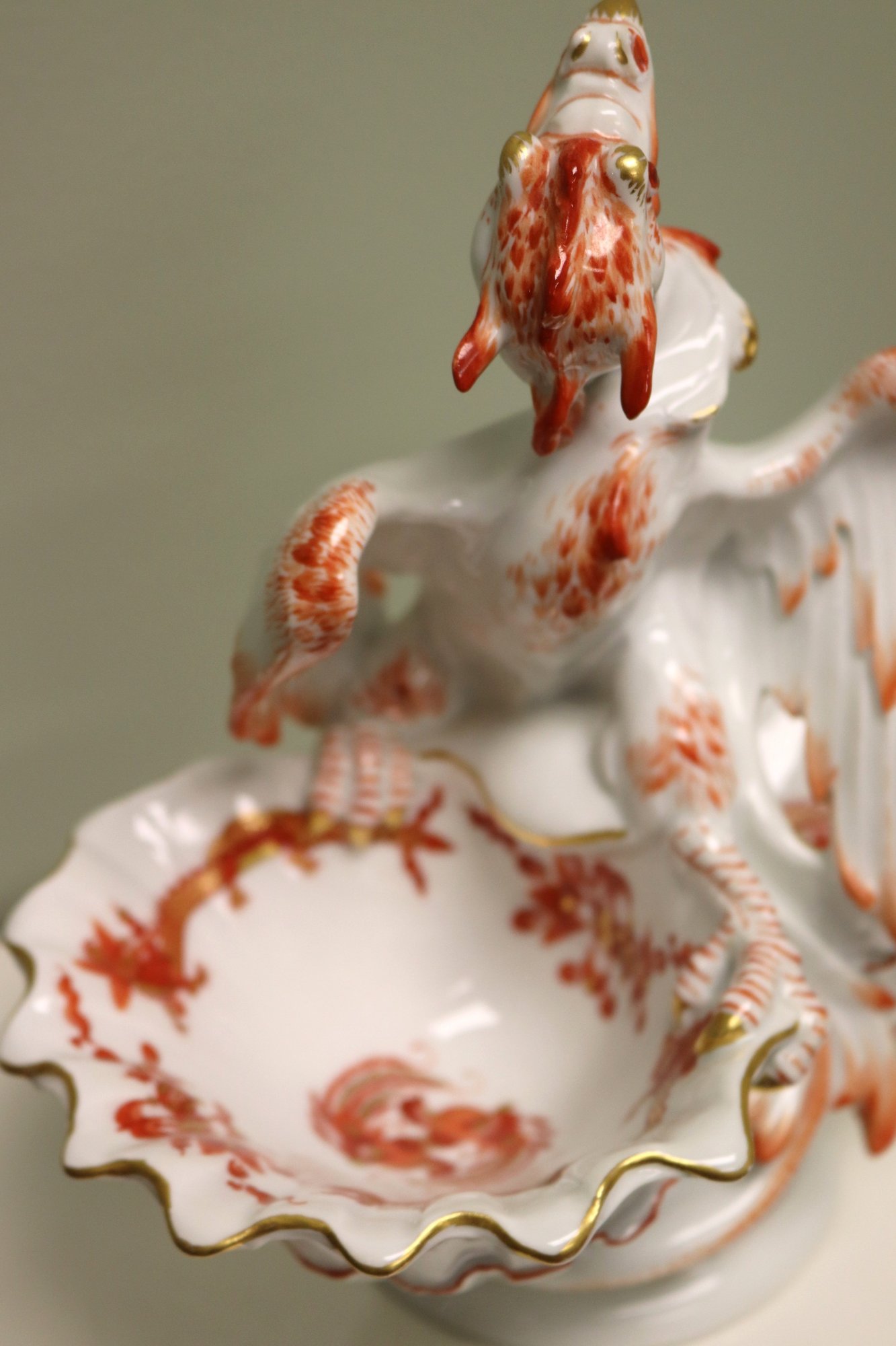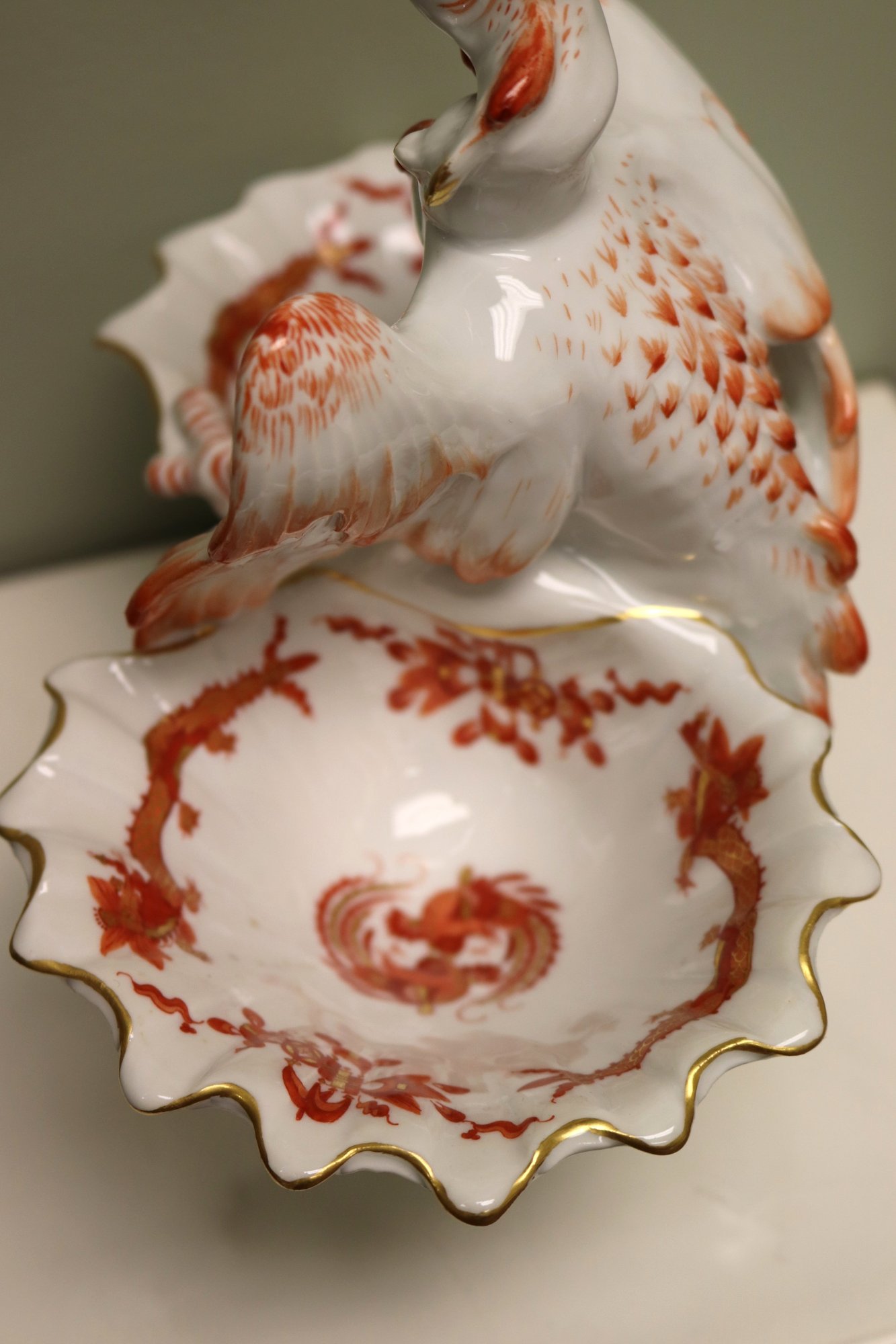 Stunning Meissen Red Ming dragon Handle double serving dish or nut dish in excellent condition. This is a rare and unique piece of Meissen featuring the red dragon design. Don’t miss this one for your collection! Measures approx. 9.5” L x 6” T