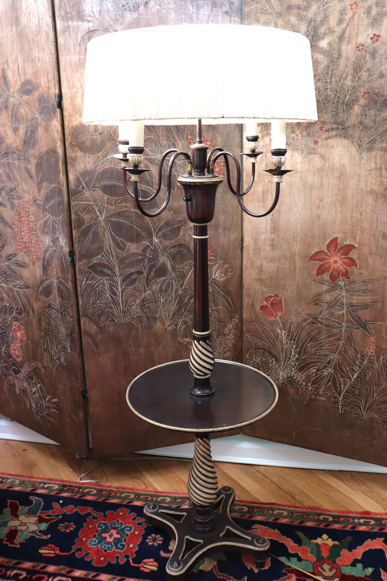 Lamp has 4 lights & lamp arms have chipping paint over original brass. Please see phot for further details. Shade Measures 21.5” Dia, Lamp is 64” T