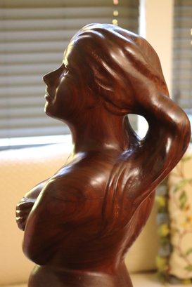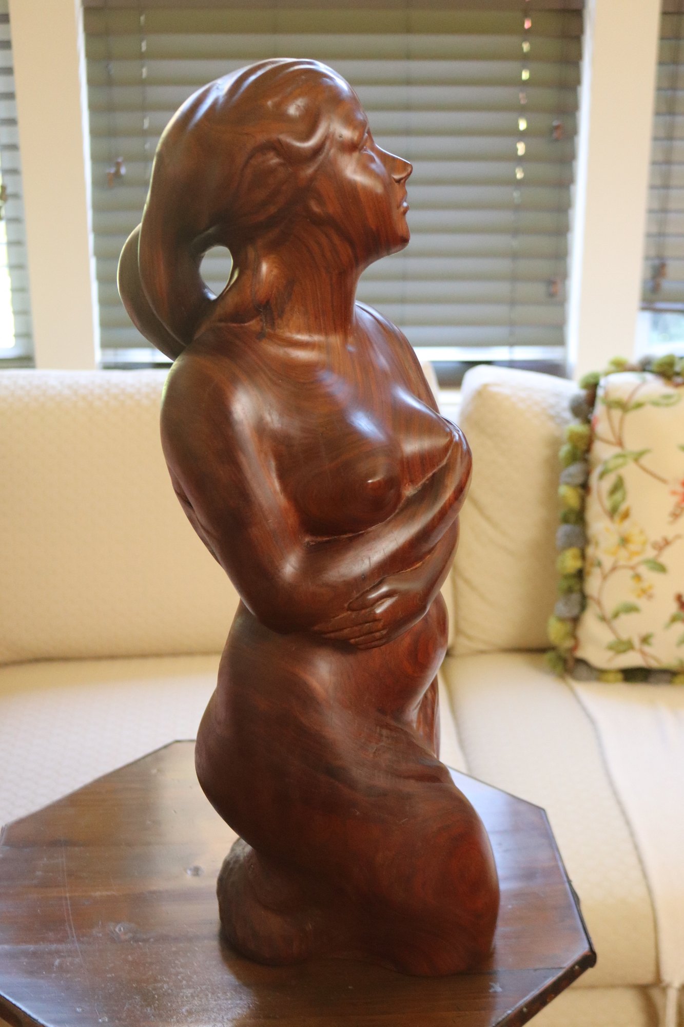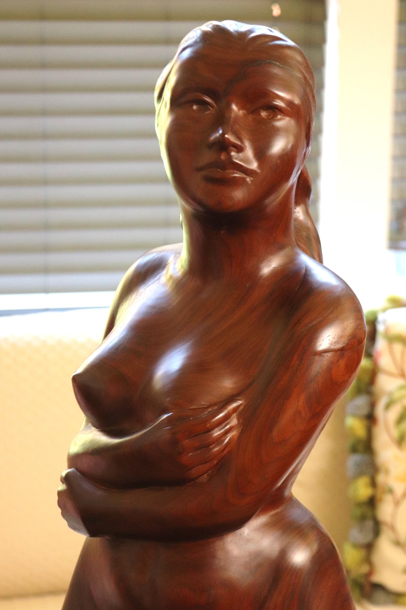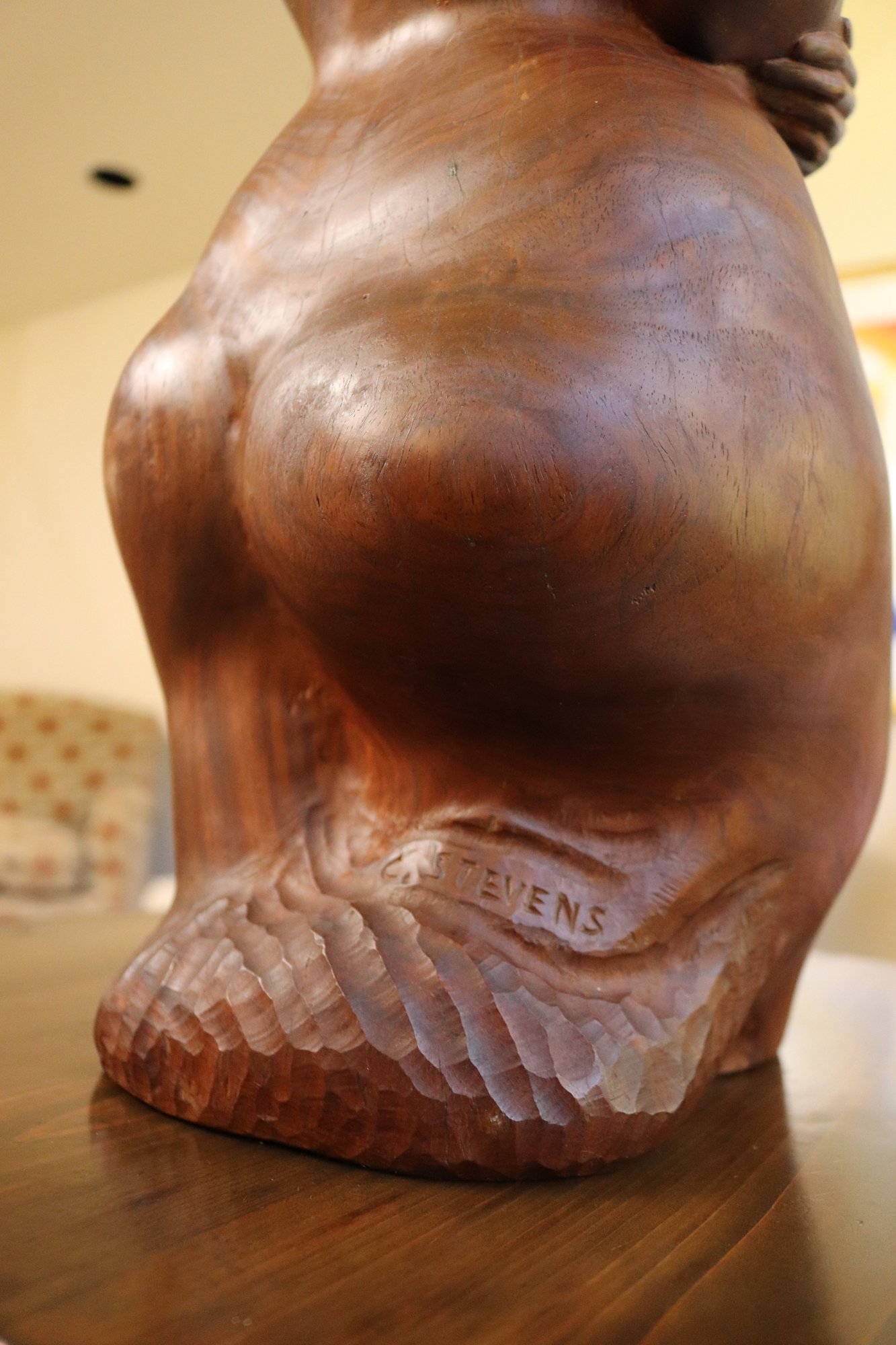 Beautifully detailed wood sculpture of seminude woman. Created from a single piece of wood, with beautifully expressed grain. piece of wood is signed C. Stevens. Measures approx. 8” x 24” T