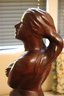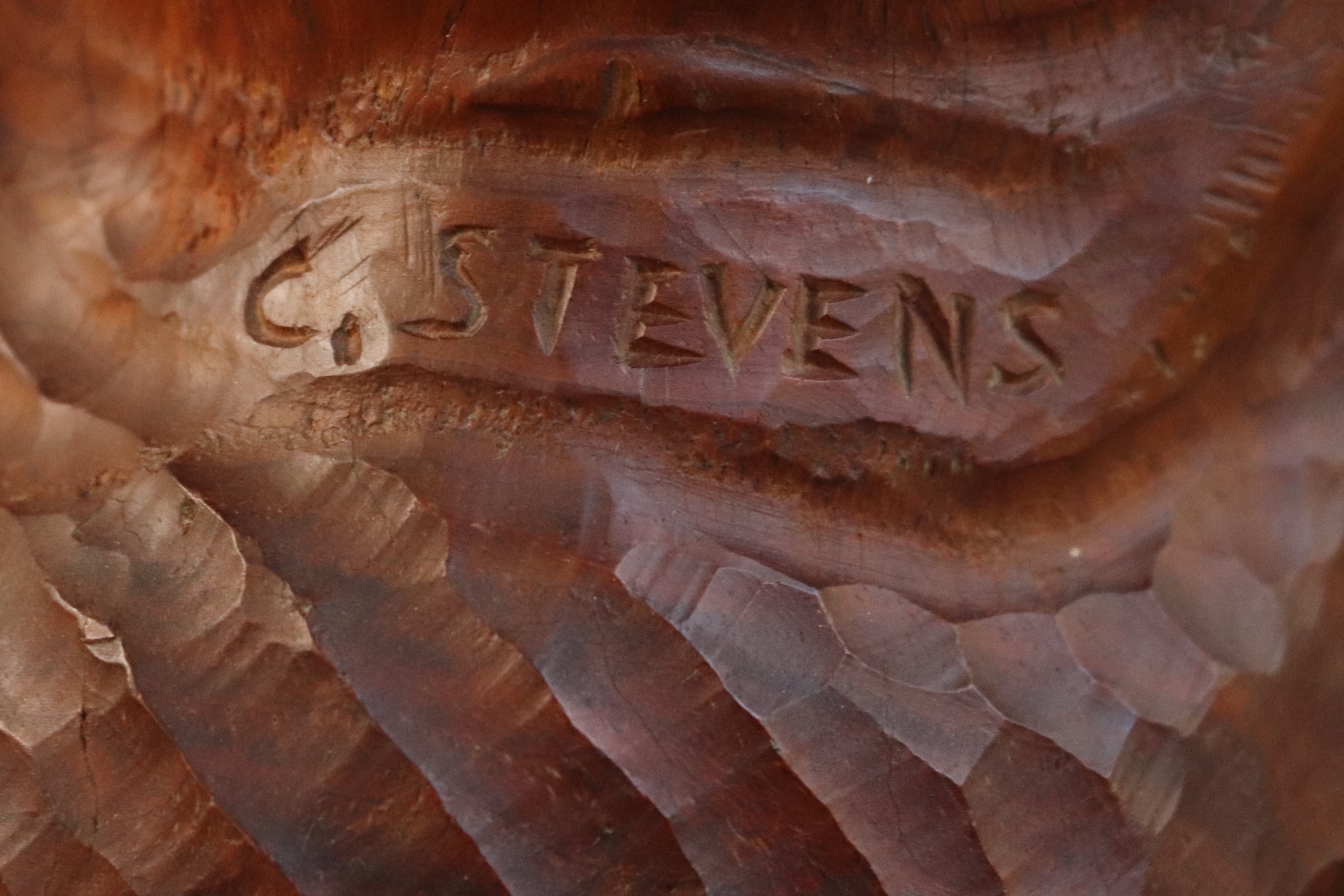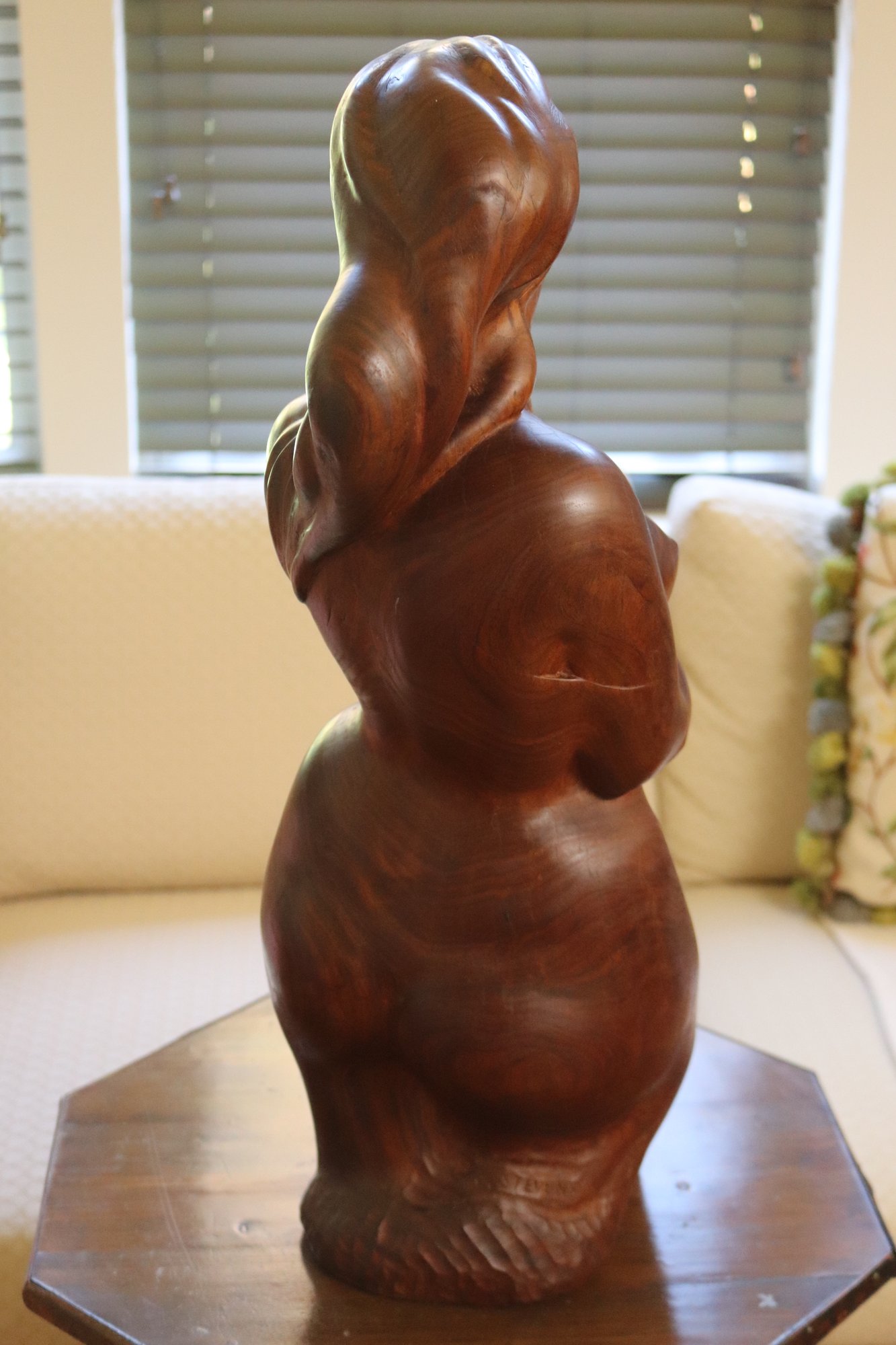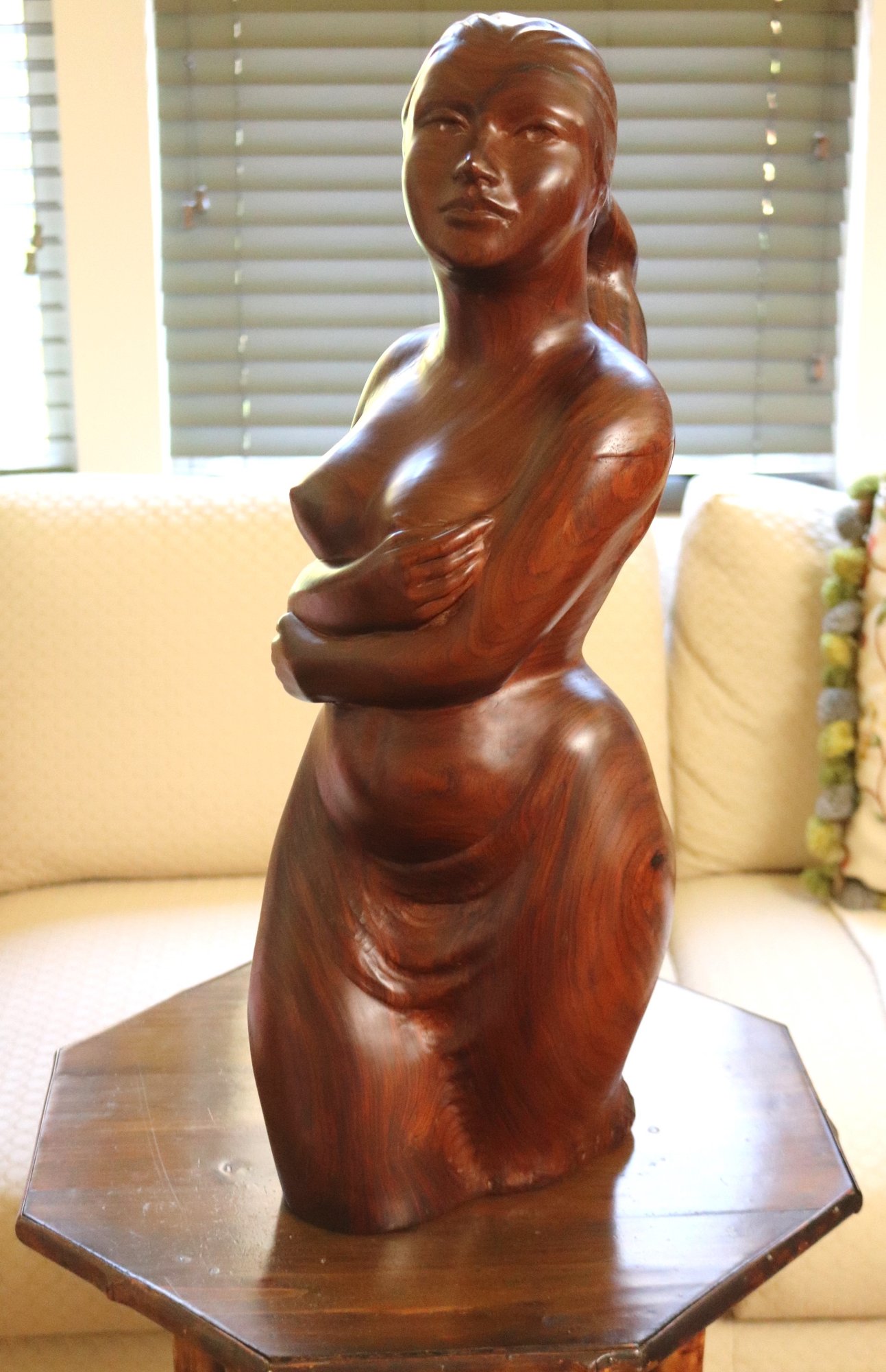 Beautifully detailed wood sculpture of seminude woman. Created from a single piece of wood, with beautifully expressed grain. piece of wood is signed C. Stevens. Measures approx. 8” x 24” T