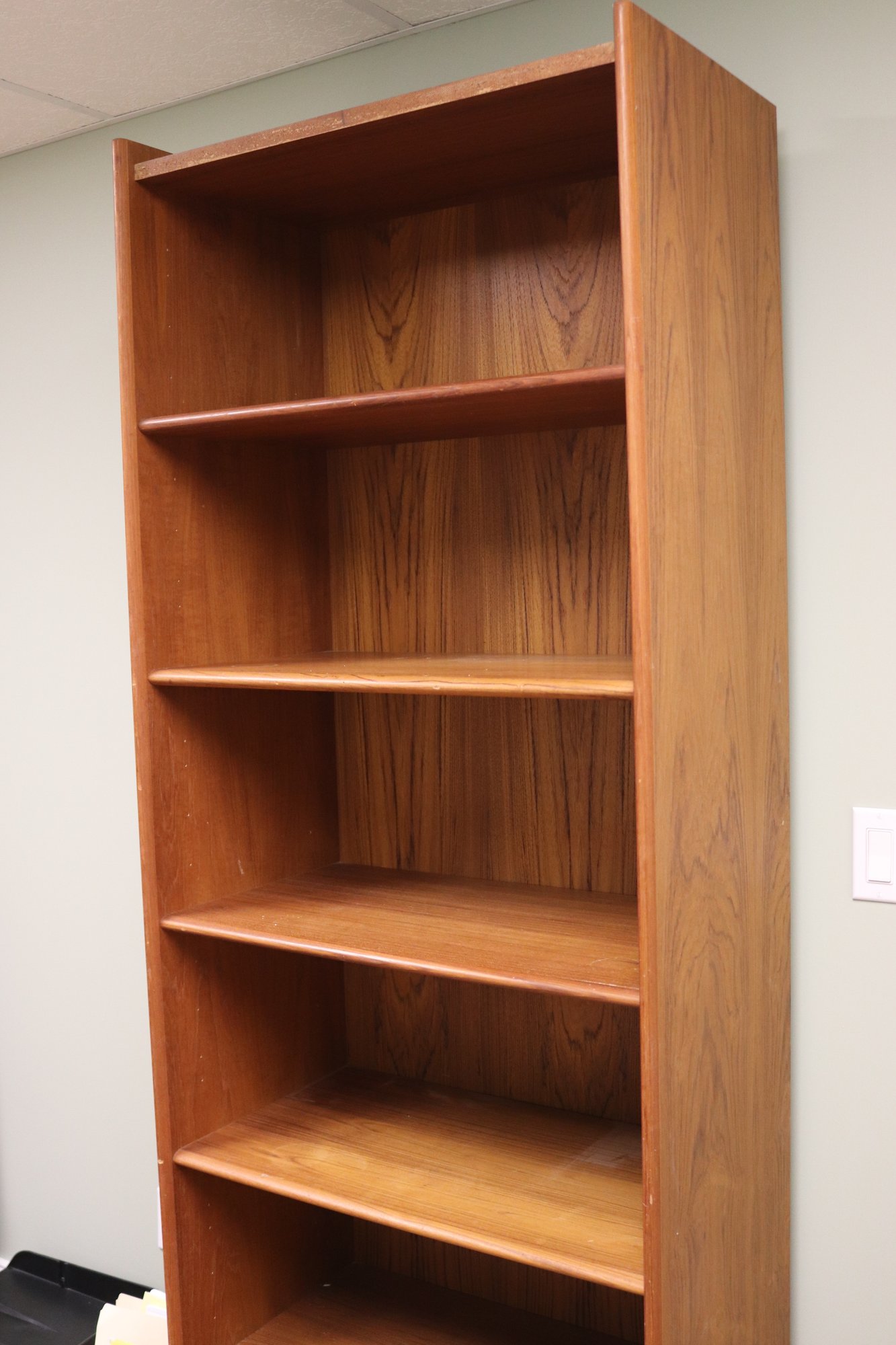 Tall Teak bookcase with 6 shelves. Please note a small strip of veneer is missing at the very top and can be replaced.