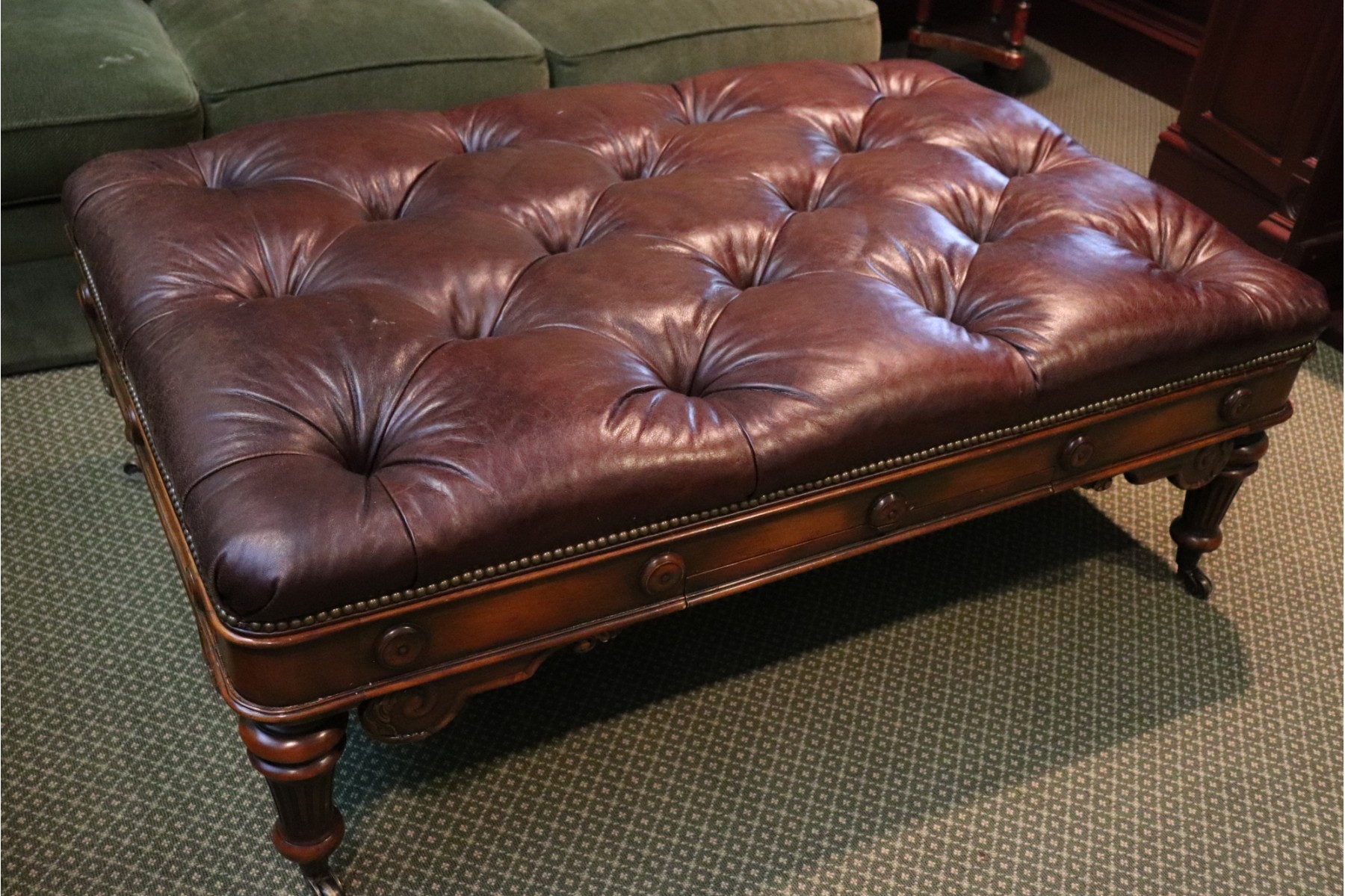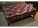 Theodore Alexander Quality Chesterfield Style Tufted Ottoman/Leather Top/Table With Hidden Slide Out Game Table Reversible Chess Board Game 2 Side Drawers For Storage. Measures Approximately 56” W X 36” D X 20” Tall. One Corner Has A Piece Of Broken Trim In Corner As Pictured.