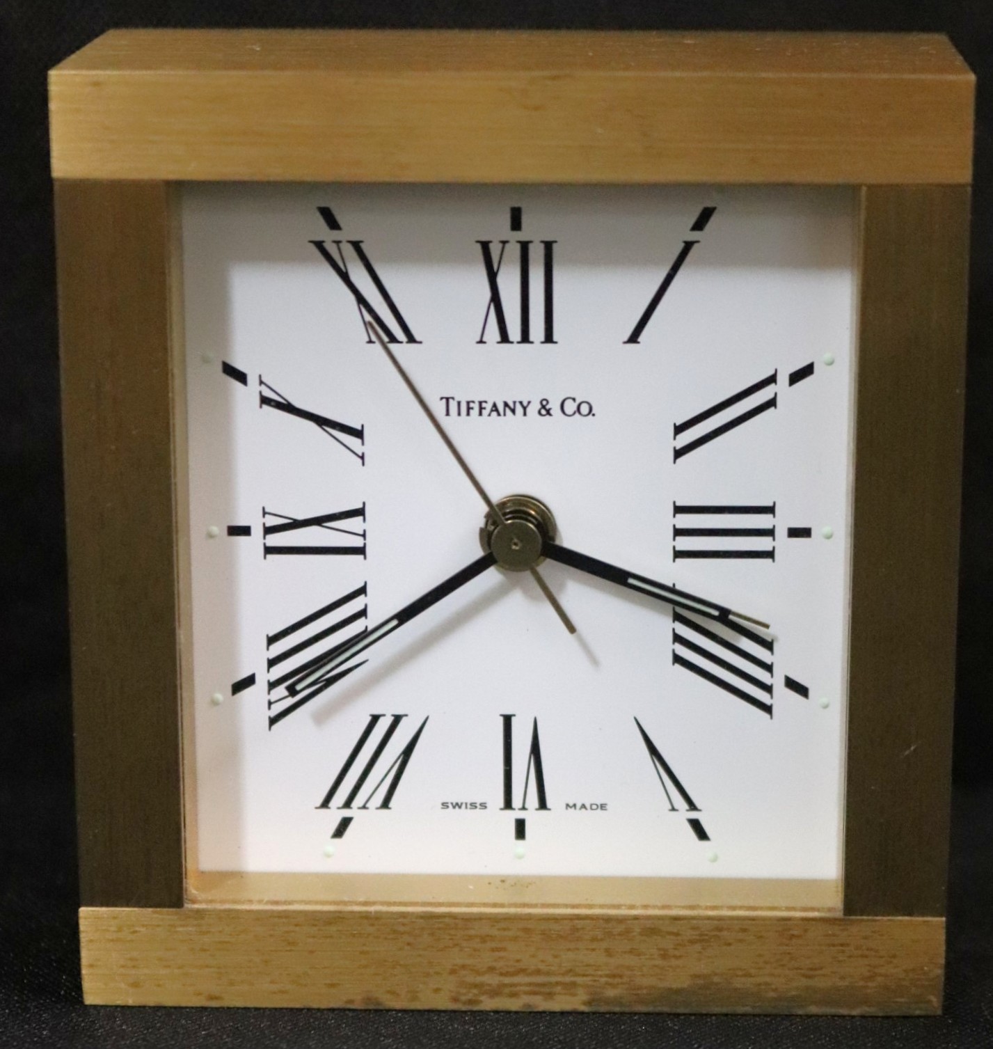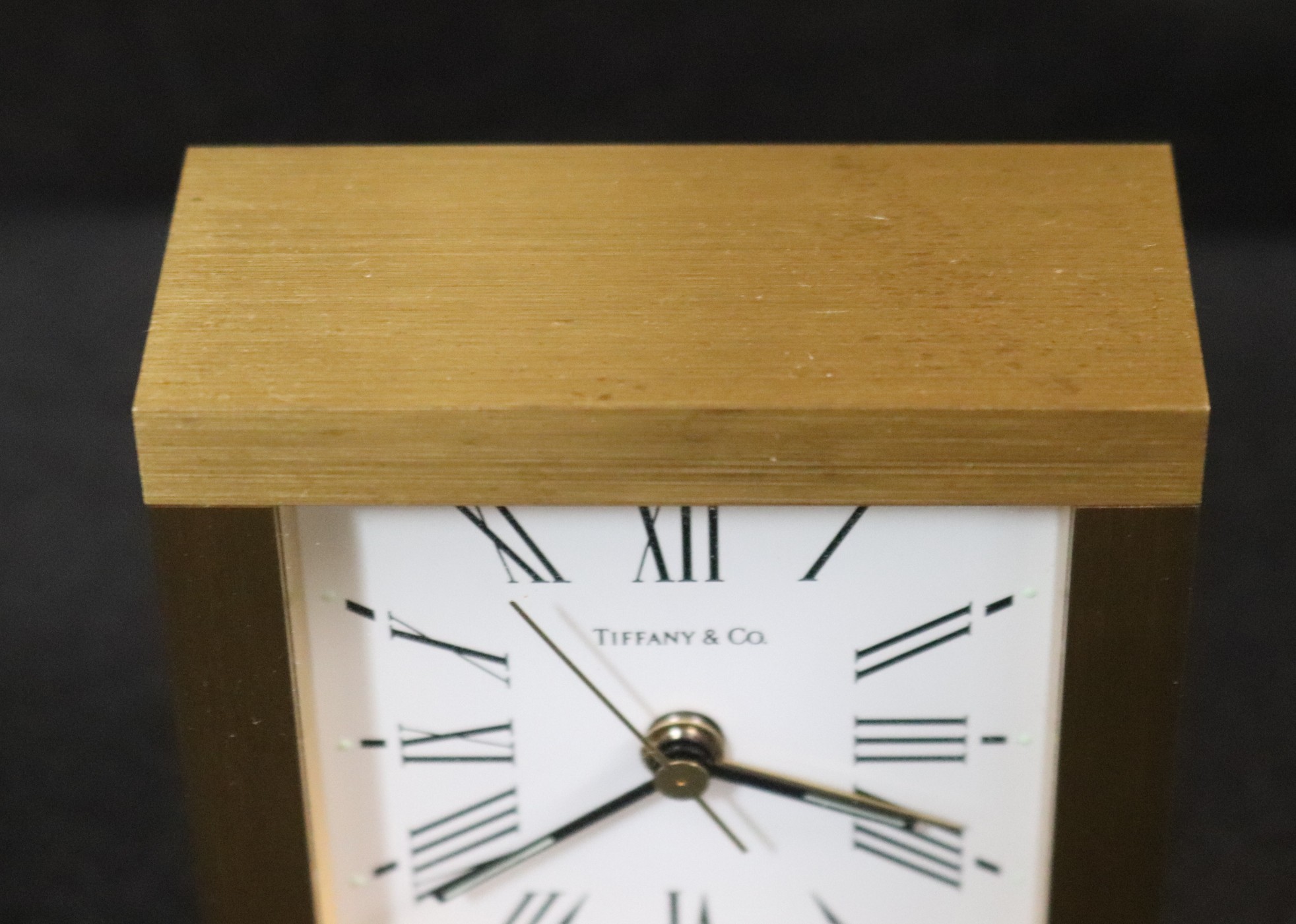 Tiffany Brass Portfolio brass quartz roman numeral desk clock. Battery operated, not tested. Please see photos for more details.