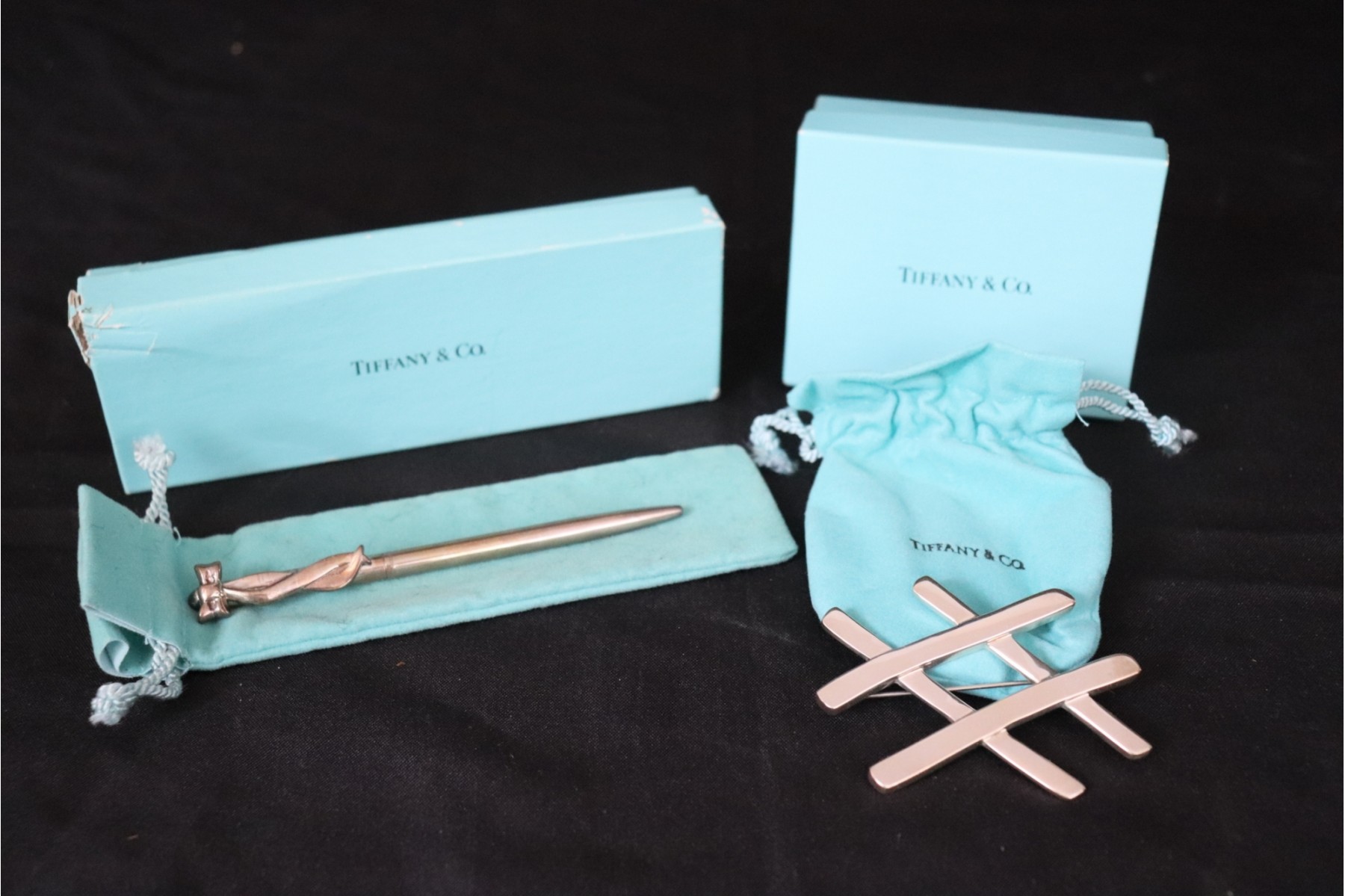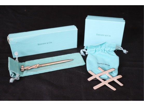 Tiffany & Co. sterling silver pen & Paloma Picasso sterling hashtag pin. Both pieces are in their original Tiffany boxes. The pen is 4.75” L, the pin is. 2.5” W, 2.5” T