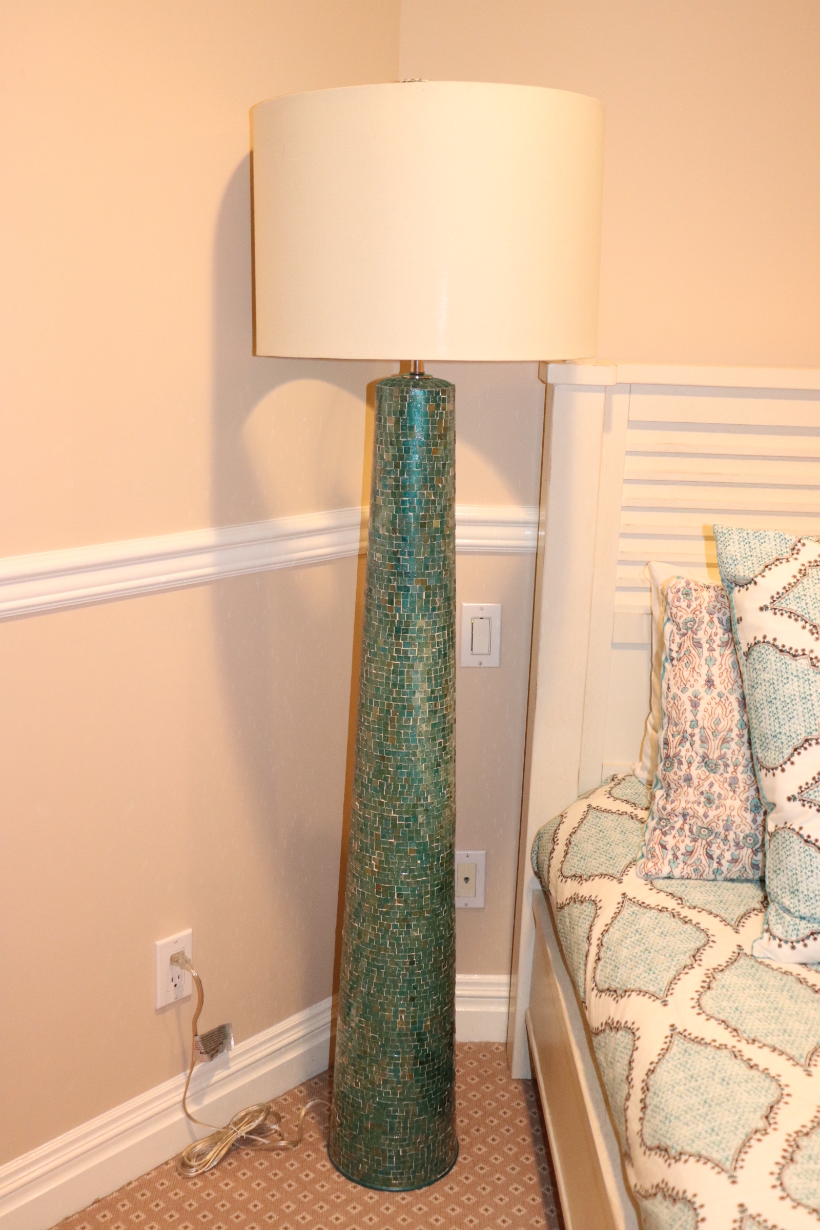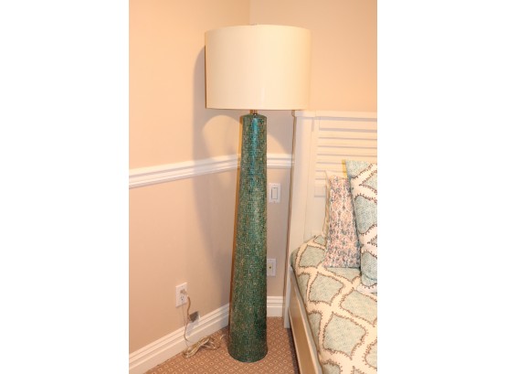 Turquoise Mosaic Tile Floor Lamp with Turquoise Interior White Drum Shade. In very good condition with minor wear as shown. Approximate Measurements: 10”Dia x 62”H with shade