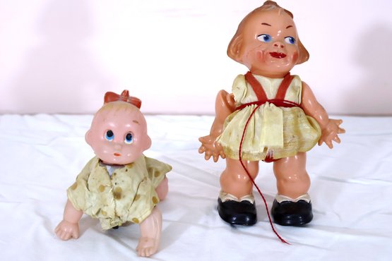 Two antique hard plastic dolls, including a mechanical crawling baby. Condition: As Is