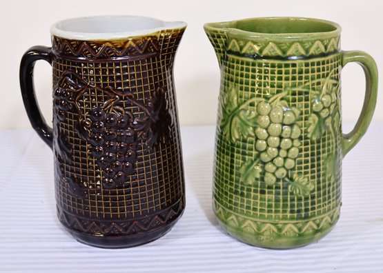 Two late 19th Century Uhl pottery pitchers grapes and lattice pattern. Approx. 6” x 9” T