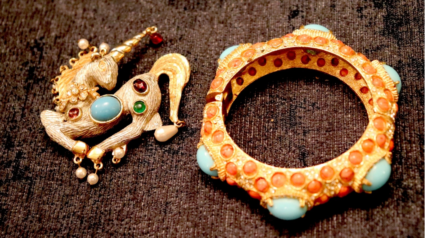 Two pieces of vintage costume jewelry by Kenneth Jay Lane. The unicorn Pin is 2.5” L, bracelet is 2” interior