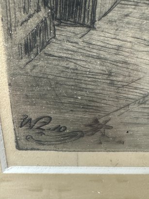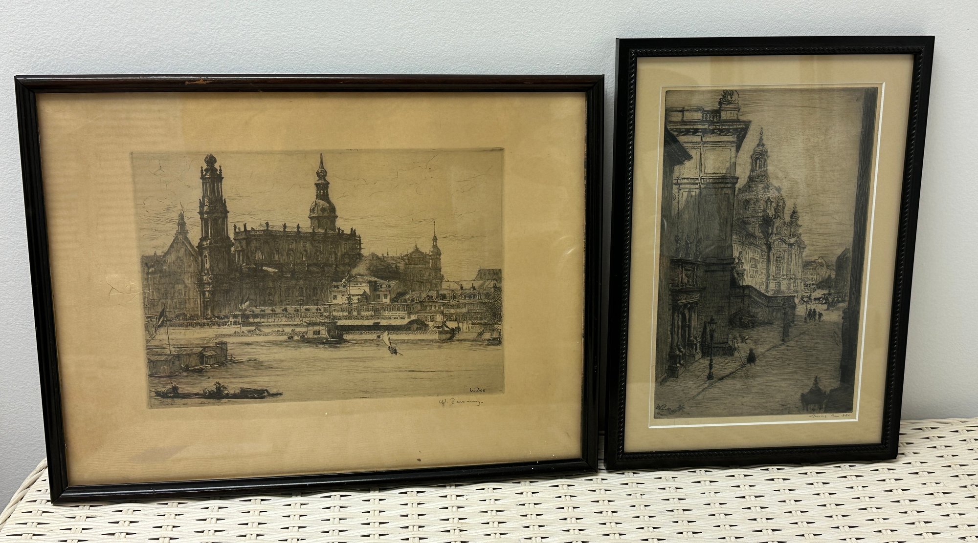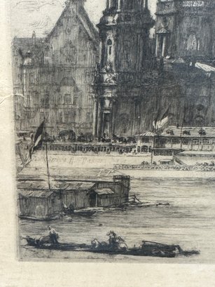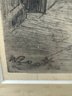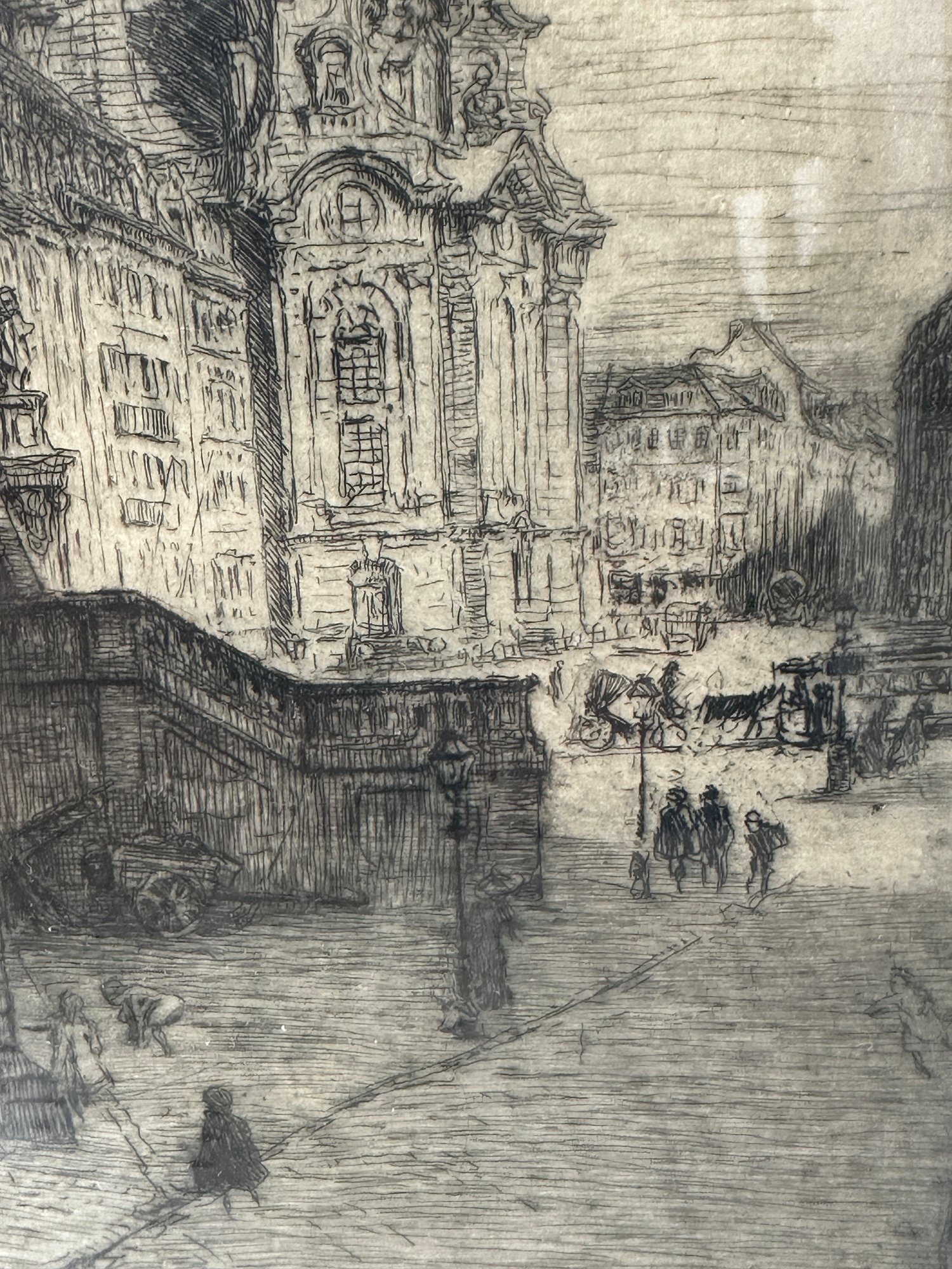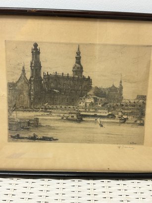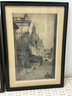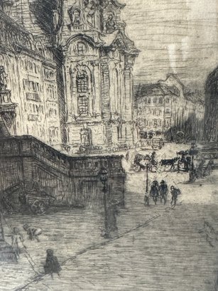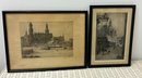 Two sepia toned antique etchings in original wood frames. The etchings are of 19 th century European street scenes featuring architecturally beautiful buildings.