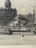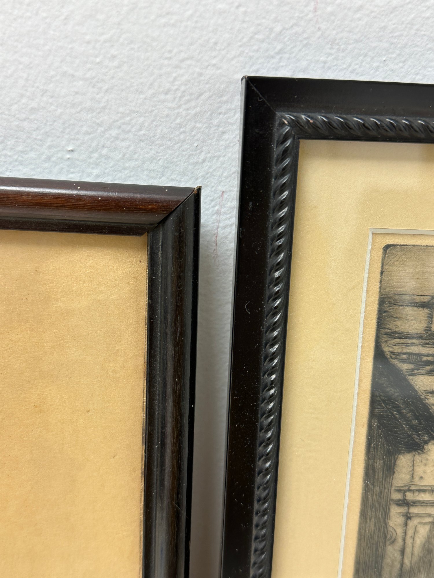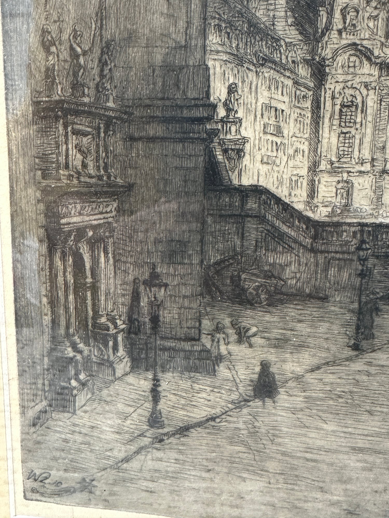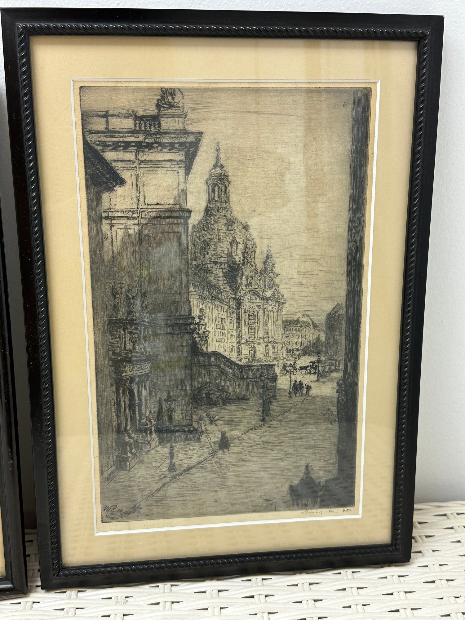 Two sepia toned antique etchings in original wood frames. The etchings are of 19 th century European street scenes featuring architecturally beautiful buildings.