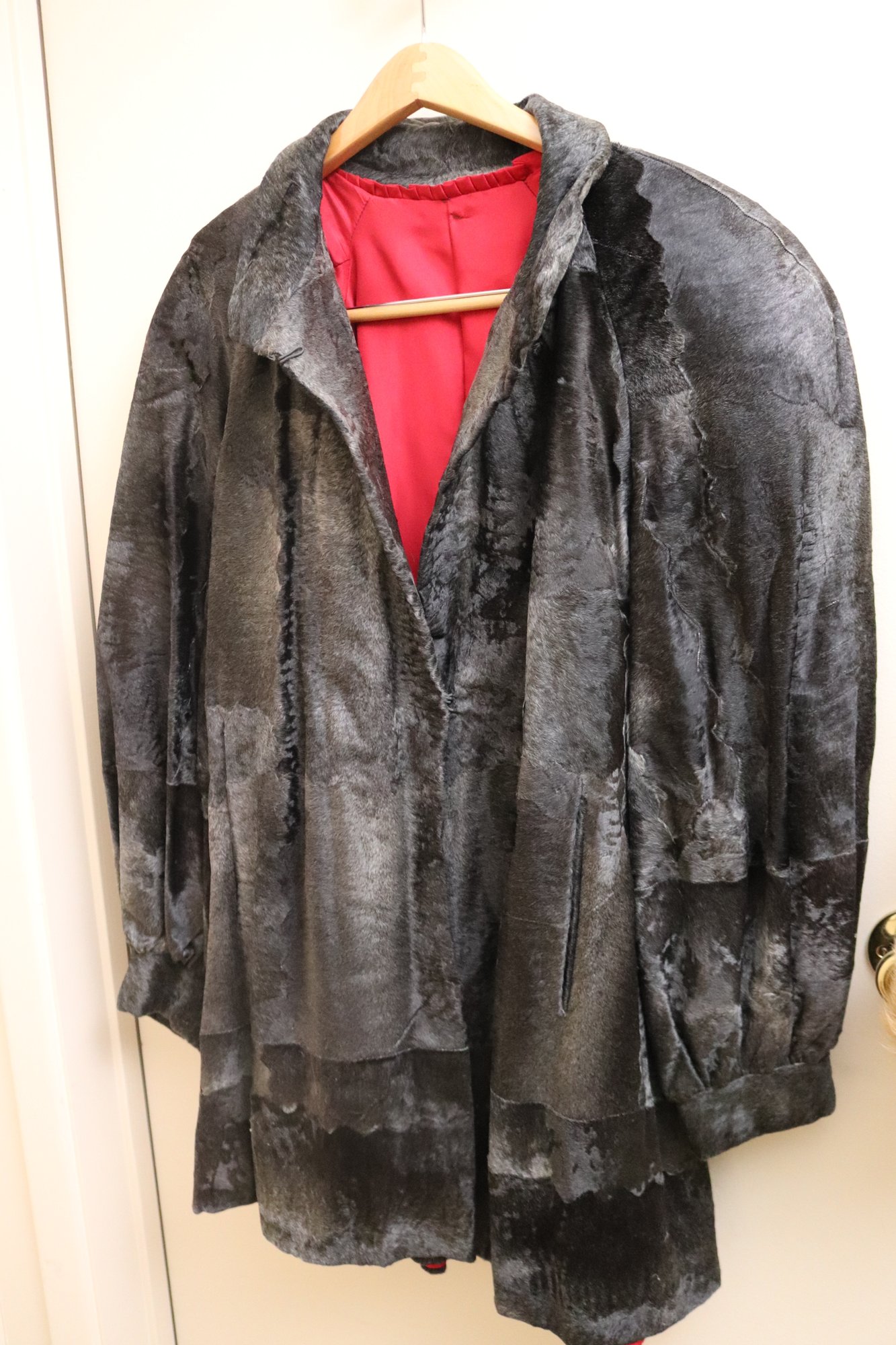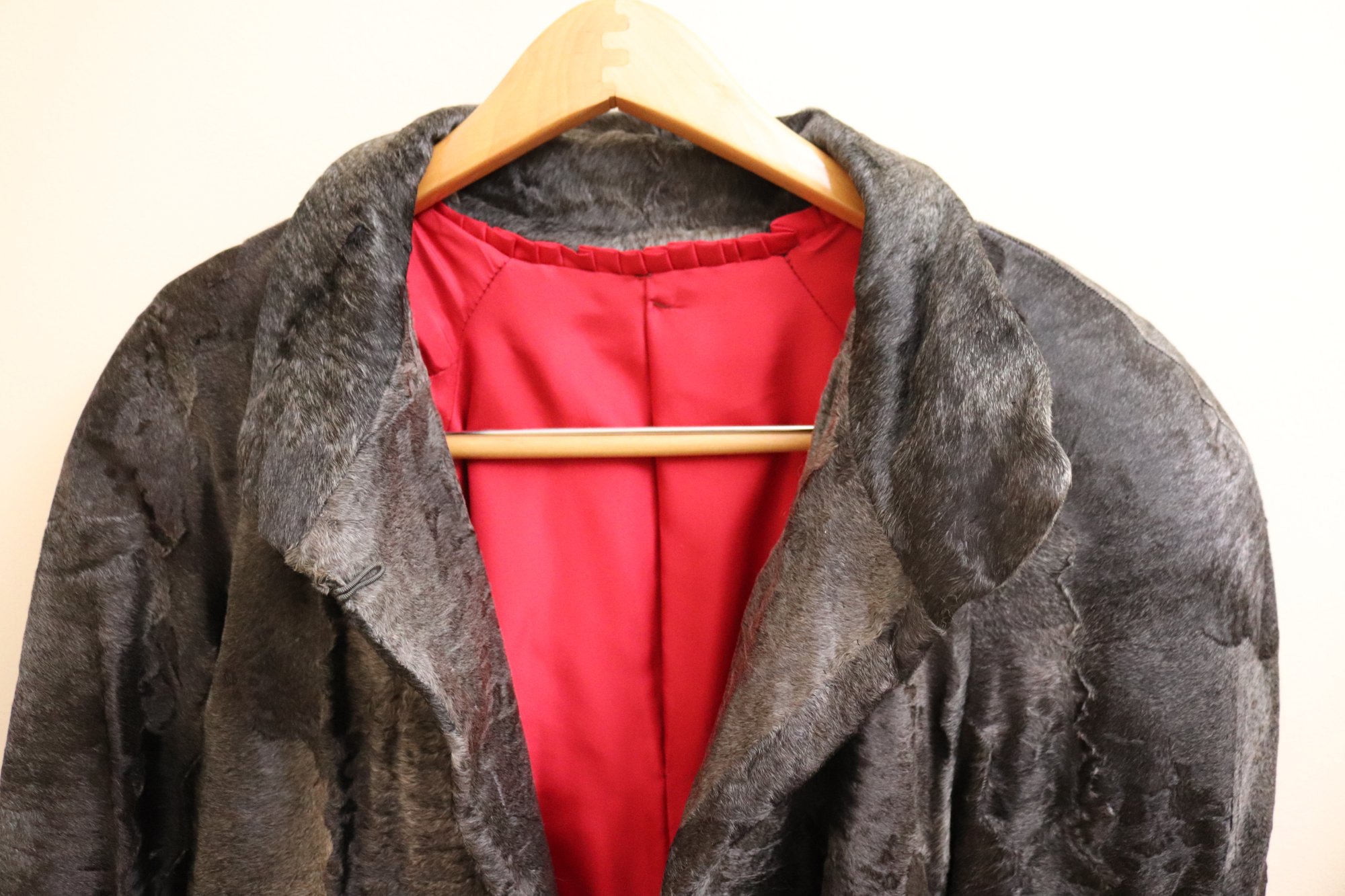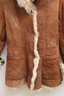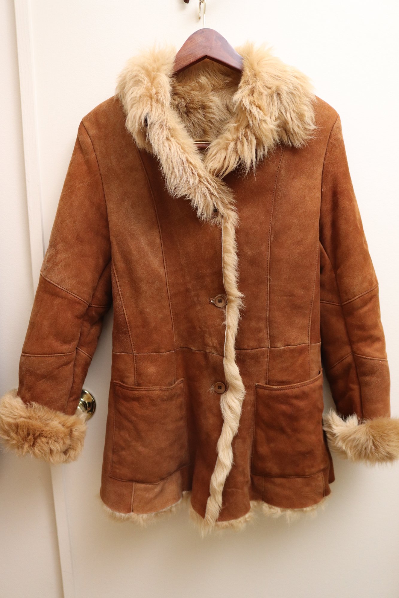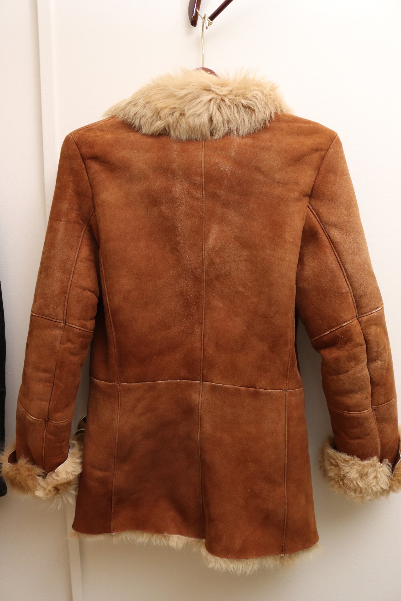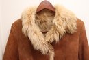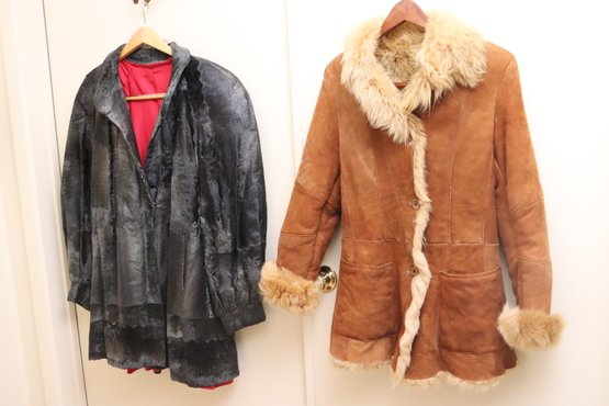 Two vintage ladies’ jackets, light brown shearling, and grey short hair leather