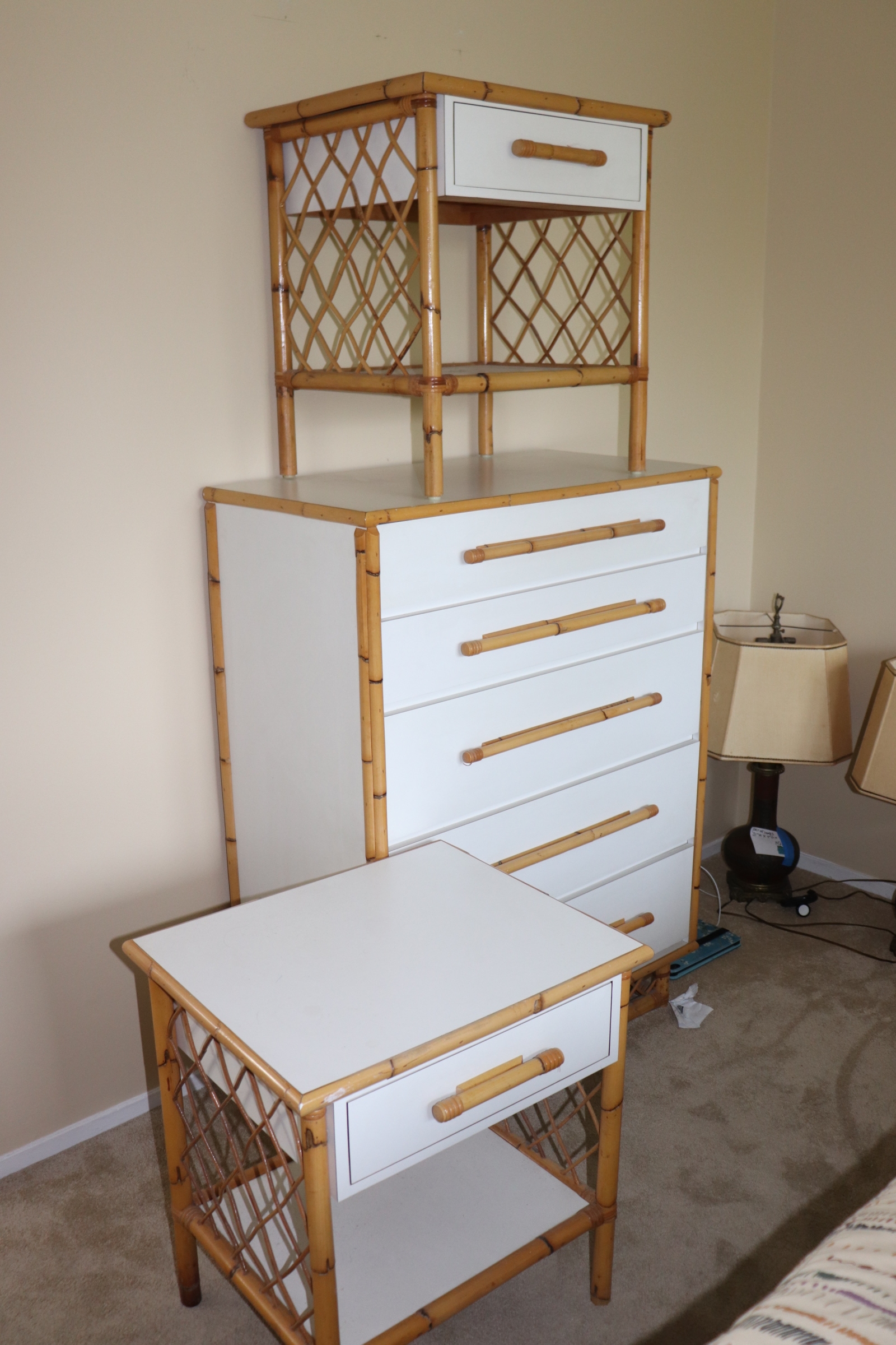 Vintage 1970’s Formica & bamboo dresser & pair of nightstands. Dresser has 5 drawers- the top sticks slightly, & the nightstands have 1 drawer & shelf. Dresser is 45.5” L x 18” D x 33.75” T Some minor age-related wear to dresser top. Please see photos for more details.