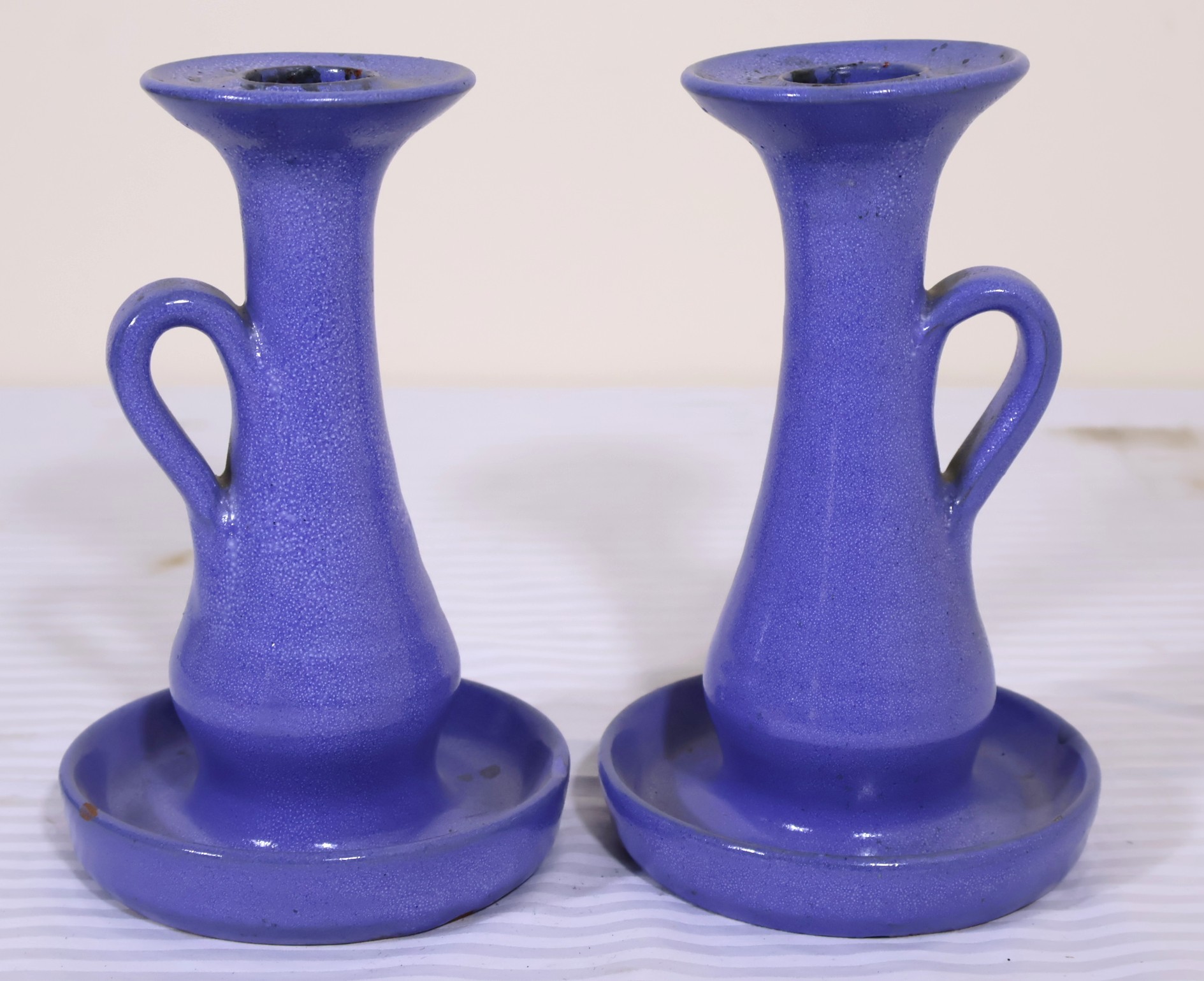 Vintage blue glazed candlesticks with handle and base, signed X on the underside. Condition: