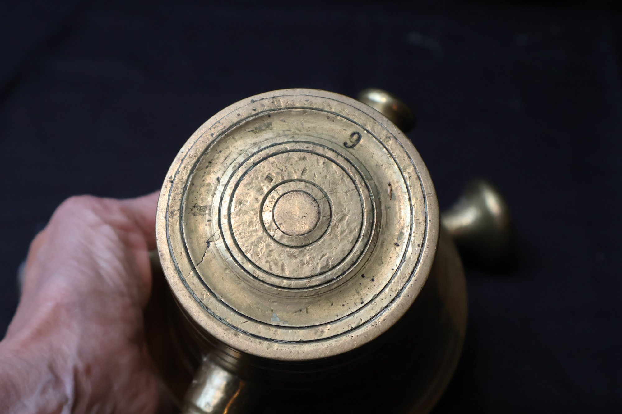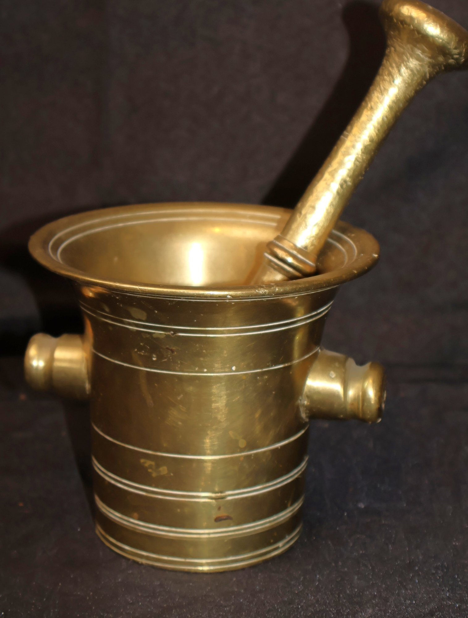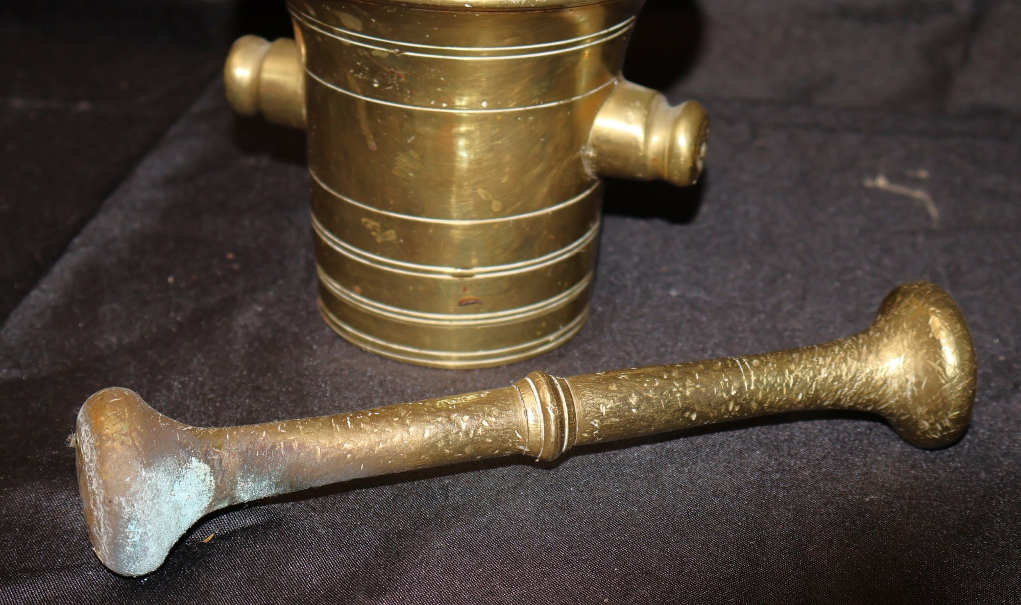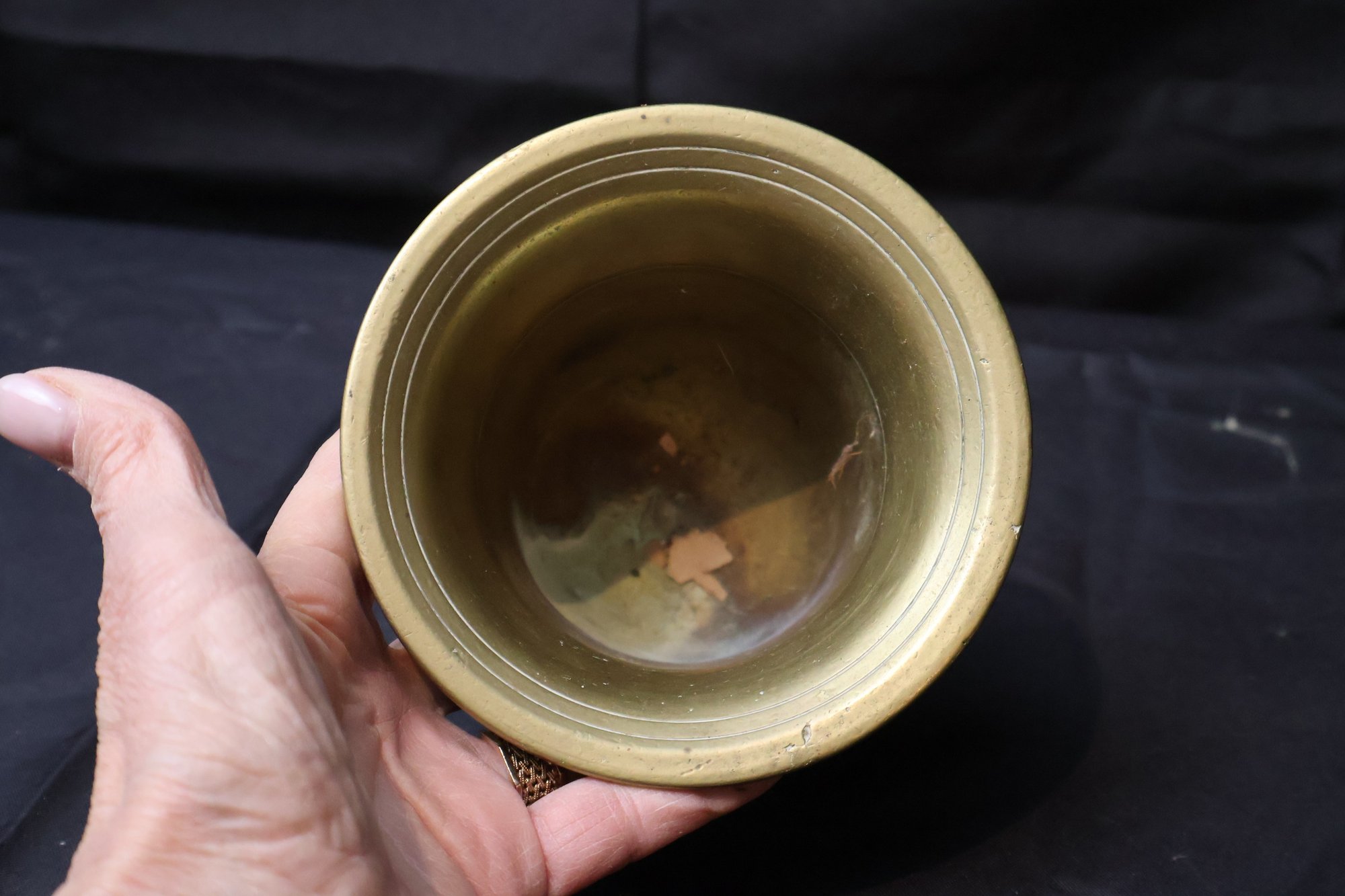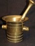 Vintage Brass mortar and pestle set measuring approximately 5” w x 4.5” tall as pictured