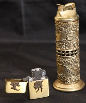 Includes a vintage Evans embossed brass lighter 6.25” tall and Marlboro zippo lighter