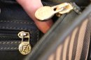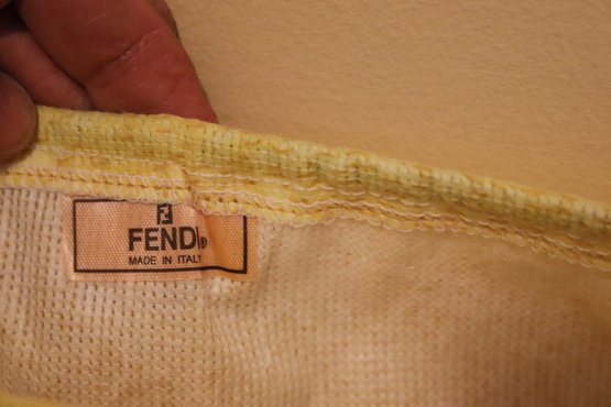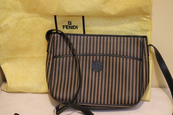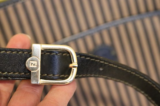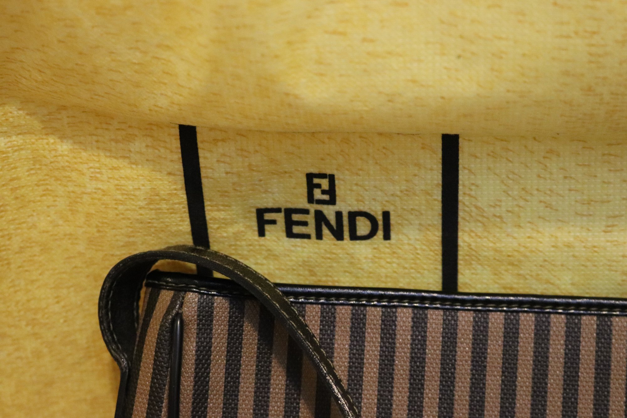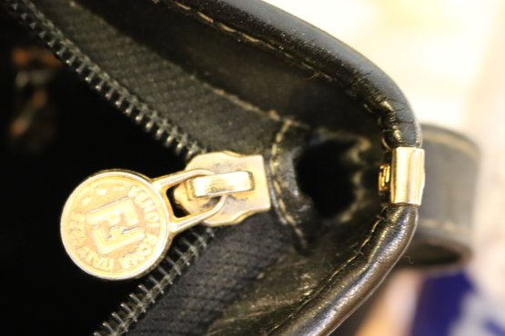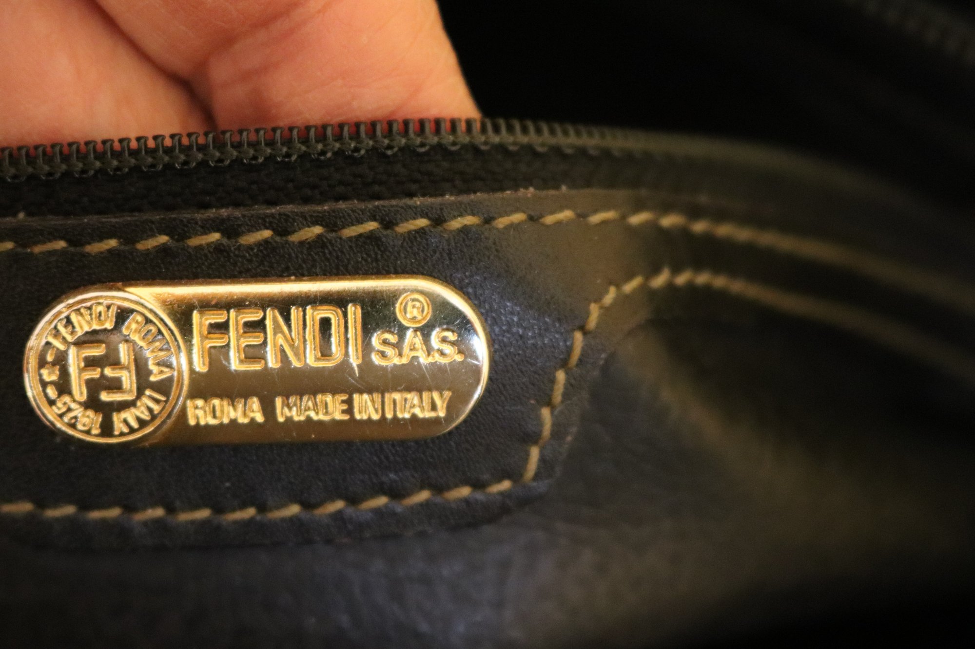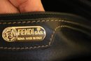 Vintage Fendi shoulder bag with exterior pocket. Stamped on interior pocket zipper, & strap buckle. Slightly loose thread on the leather Fendi circle. Please see all photos. Measures 10” x 8” plus adjustable strap. Includes dust bag