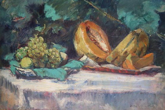 Vintage Framed fruit still life painting on canvas measuring approximately 32” W x 26”