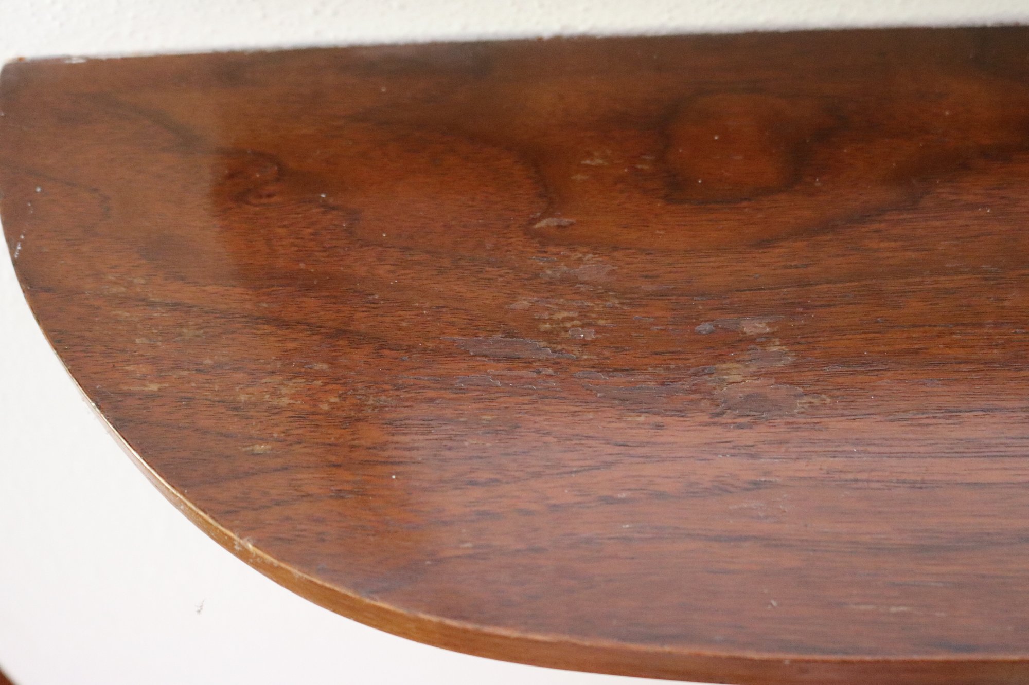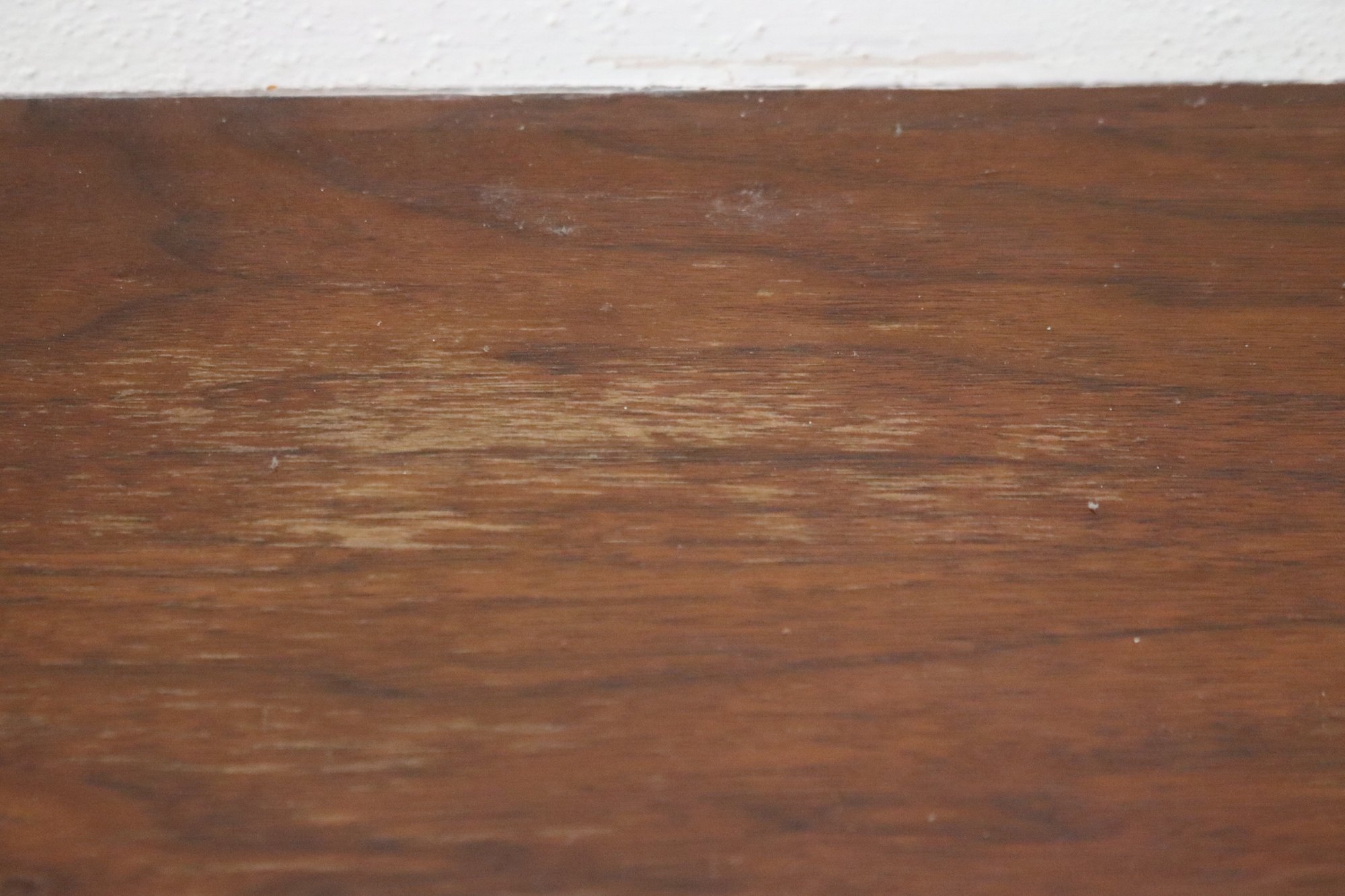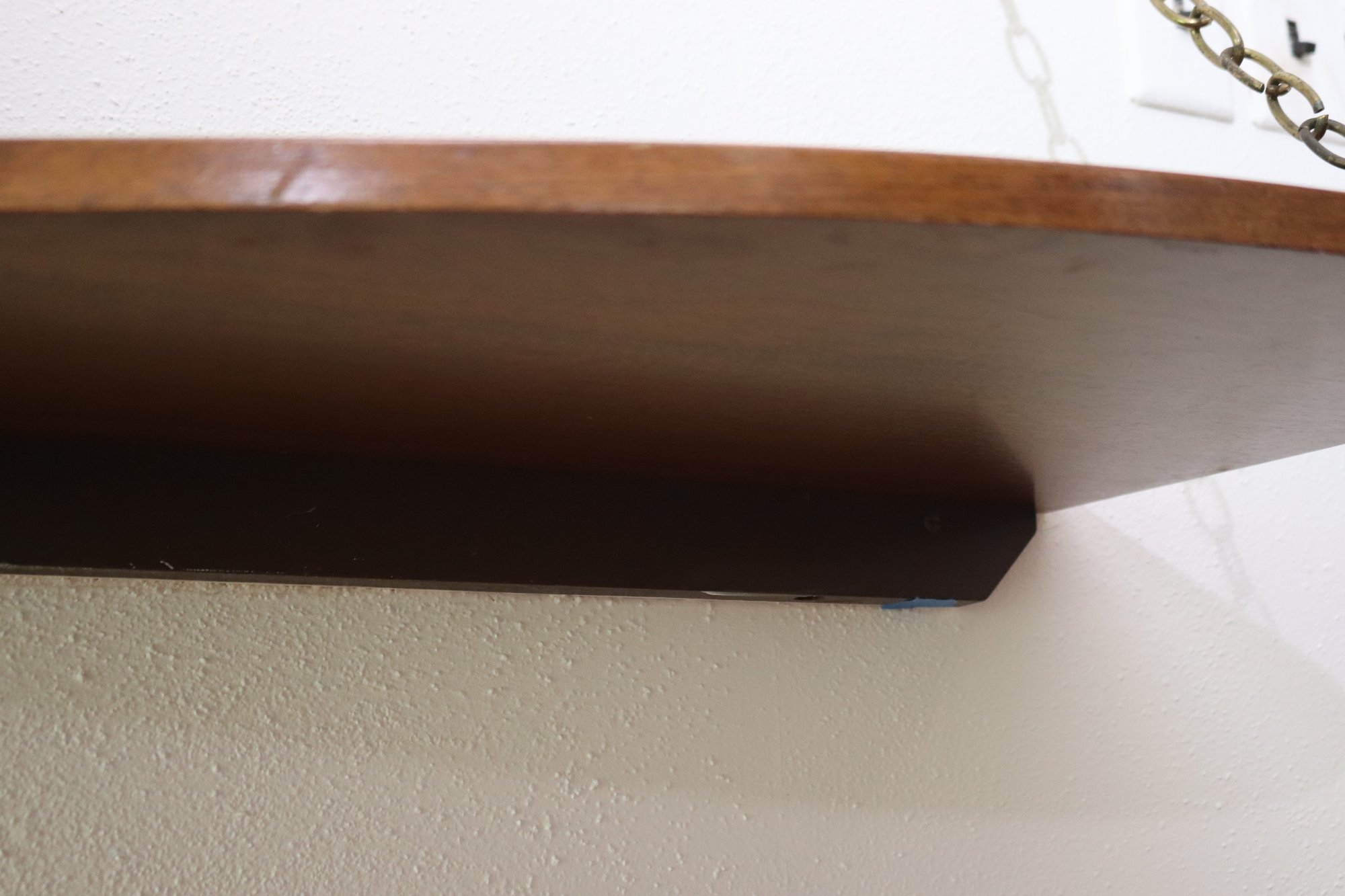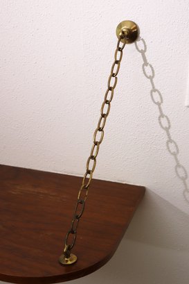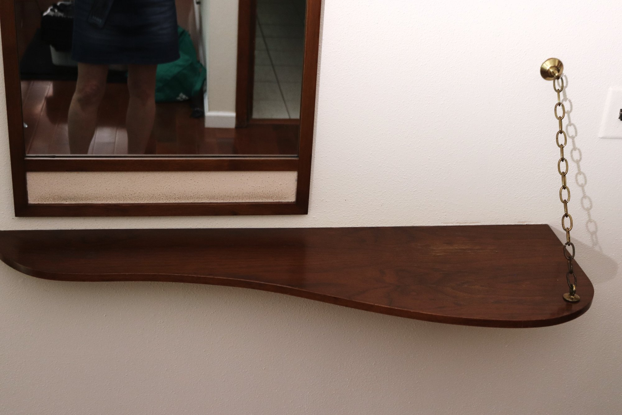 Vintage MCM floating console with brass chain attachment, shows some slows of finish