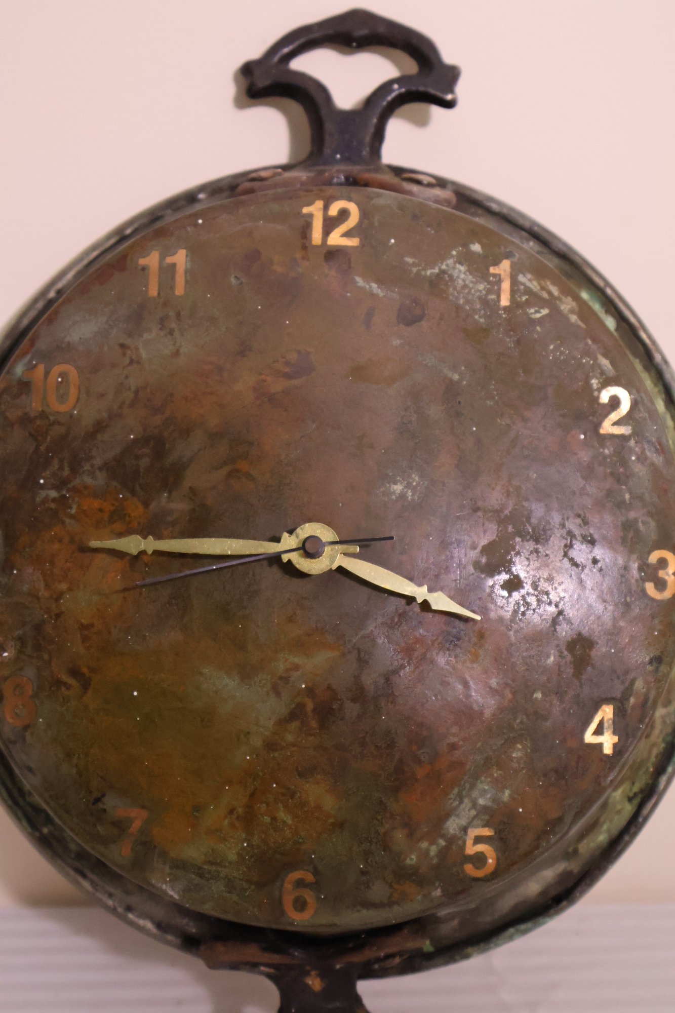 Vintage oxidized copper pot with contemporary battery clock. 9” round + 2” handles.
