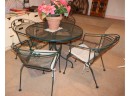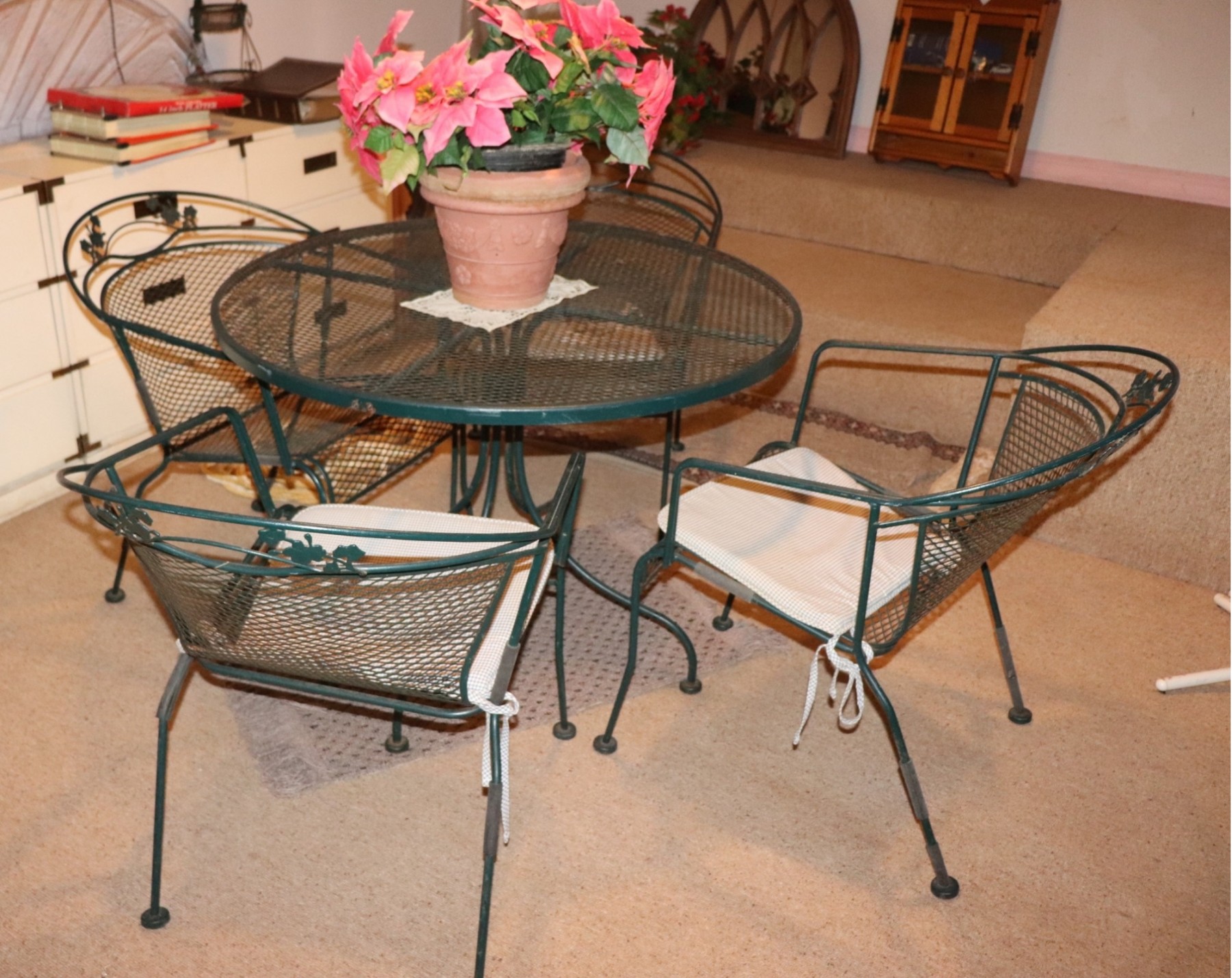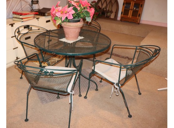 Vintage Sunbeam painted green wrought iron patio set with round table and dining 4 chairs. Includes faux poinsettia plant as shown. In very good used condition with age-appropriate patina and minor wear on some edges as shown. Please see photos for more details. Approximate Measurements: Table: 40”Dia x 28”H, Chairs: 25”W x 27”D x 30.5”H
