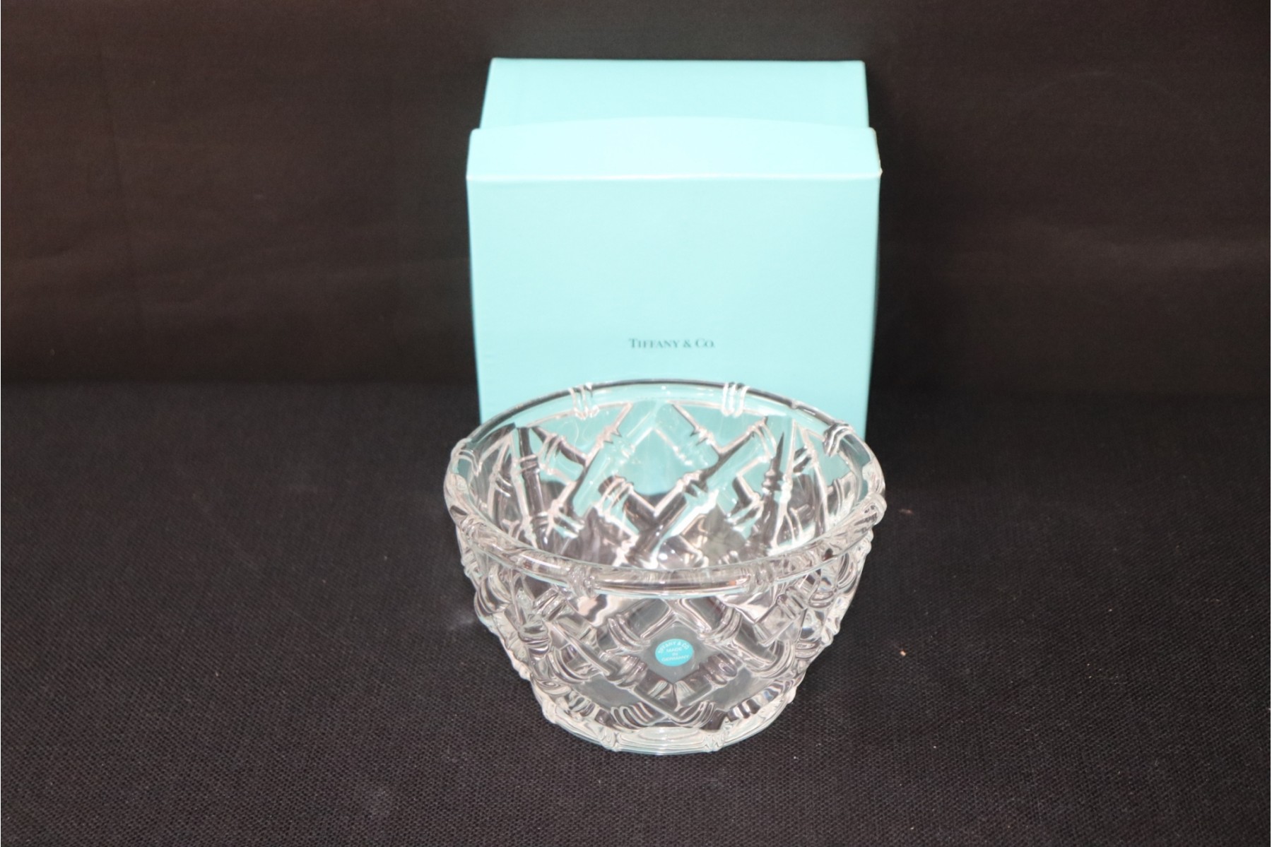 Vintage Tiffany candy dish with a raised bamboo pattern, in its original box. Bowl measures 6.5” Dia.x 4” T