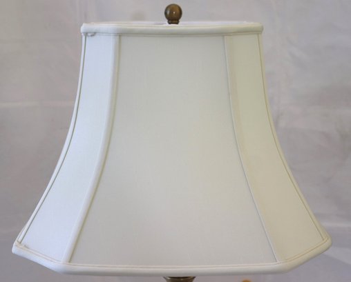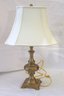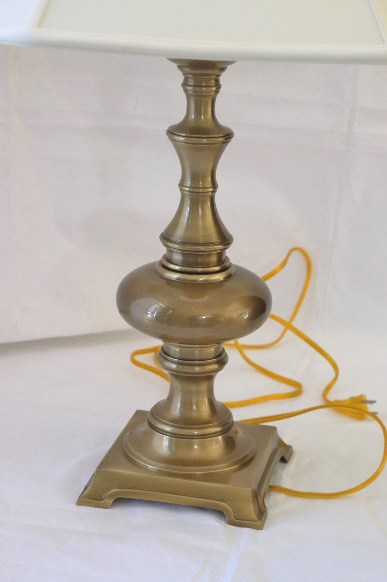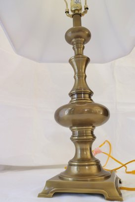 Vintage traditional style rubbed polished brass bedside table lamp, stands Approximately 28” tall with a 16” shade in good working condition.