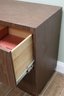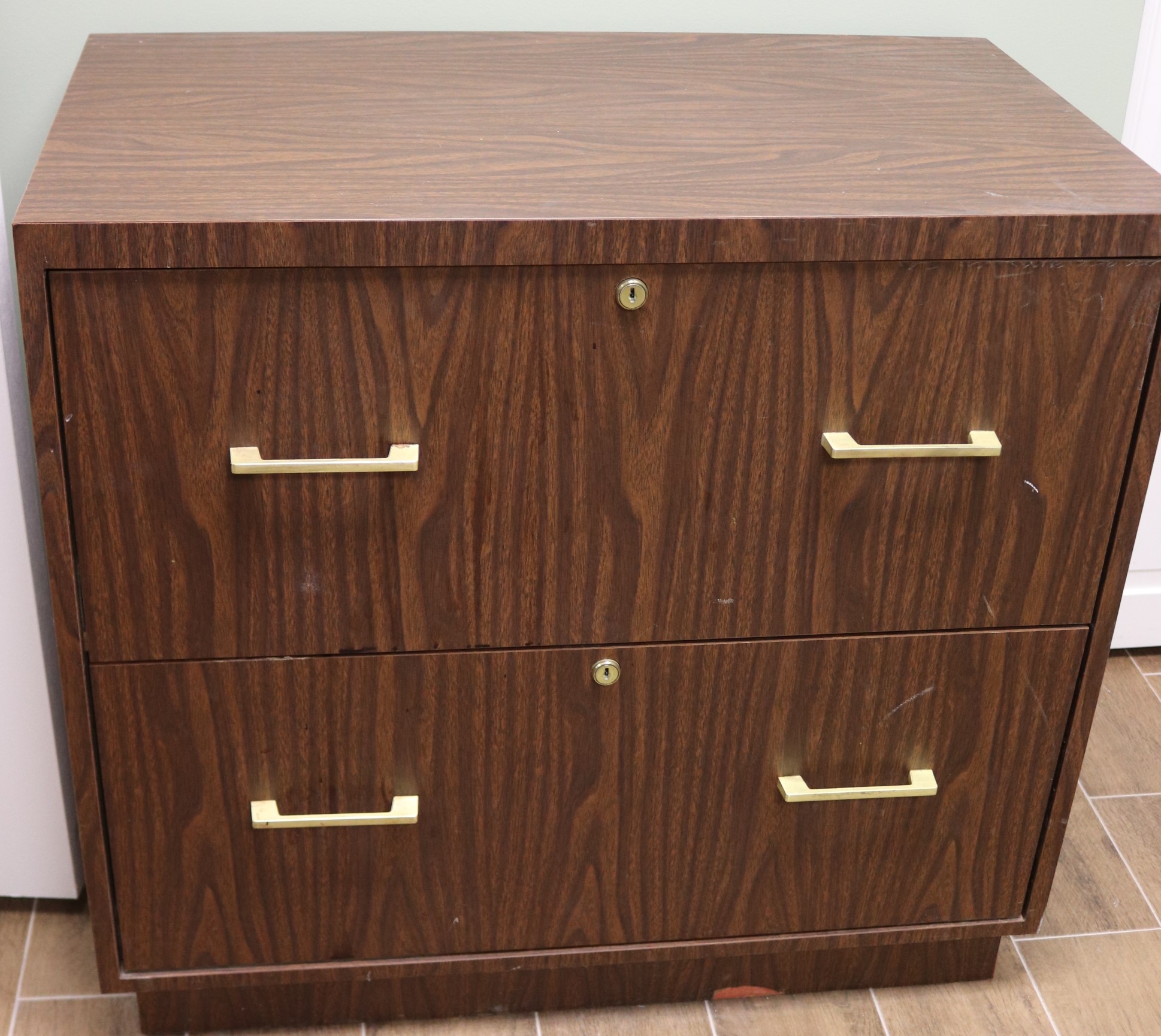 Vintage two drawer file cabinet. Has a small, chipped veneer area on the bottom. Measures 32”x 18”x29” T