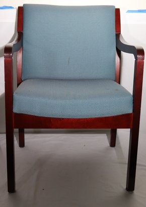 Vintage wood chair shows some stains, age-appropriate scuffs as pictured, will look nice with some TLC and new fabric. This piece measures approximately 22” w x 22” d x 32” tall. The seat height is 17” tall.