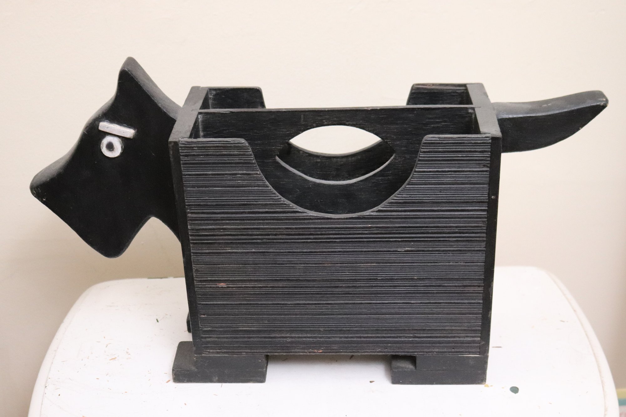 Vintage wood terrier magazine stand as pictured, measures Approximately 24” w x 6” d x 14” tall.