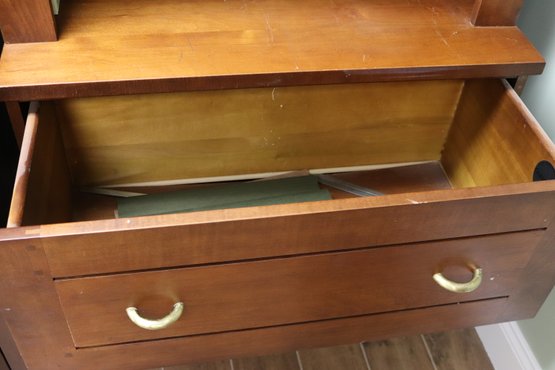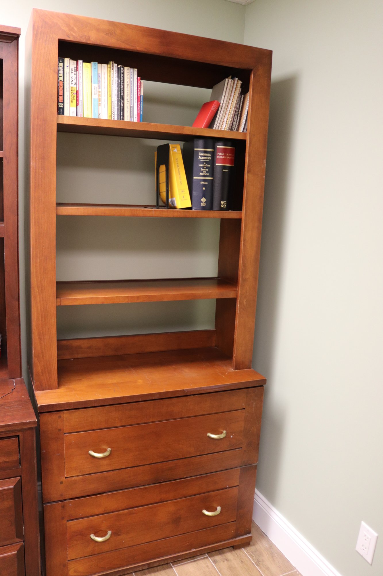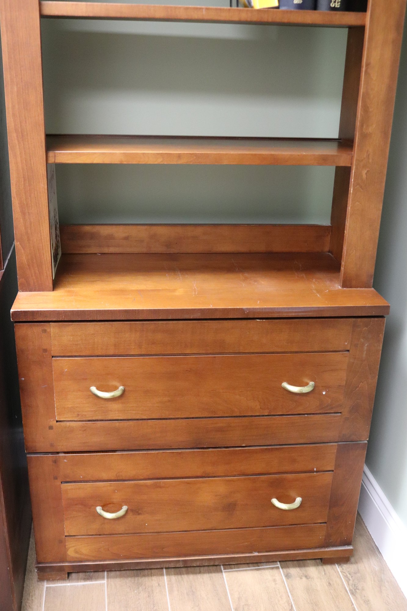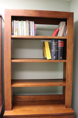 Vintage wooden Crate & Barrel bookcase file cabinet with 4 shelves and curved gold handles. Measures Approx 42” L x 16” D x 76” T