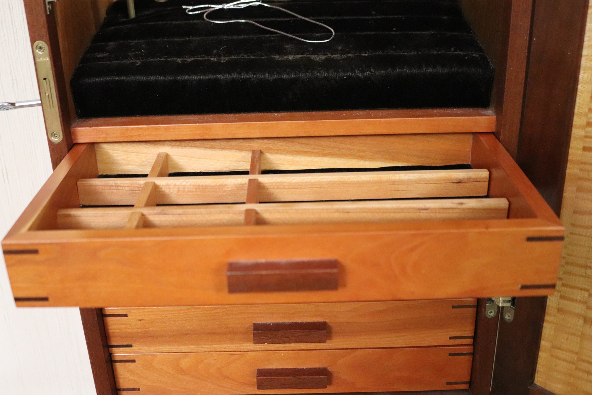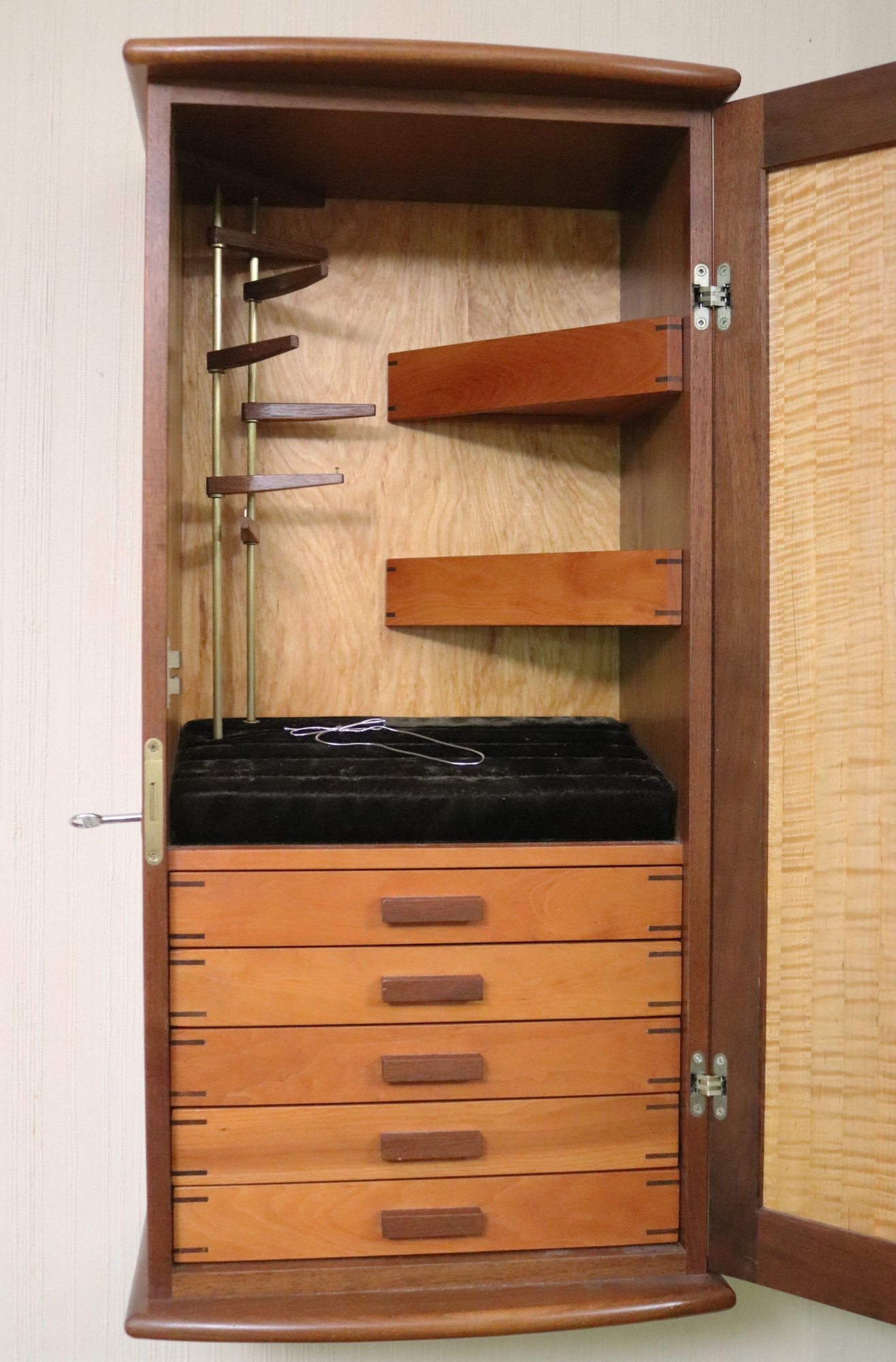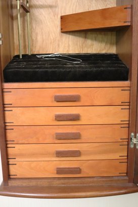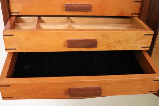Wall mounted Jewelry case measuring approximately 15” w x 10” d x 31” tall