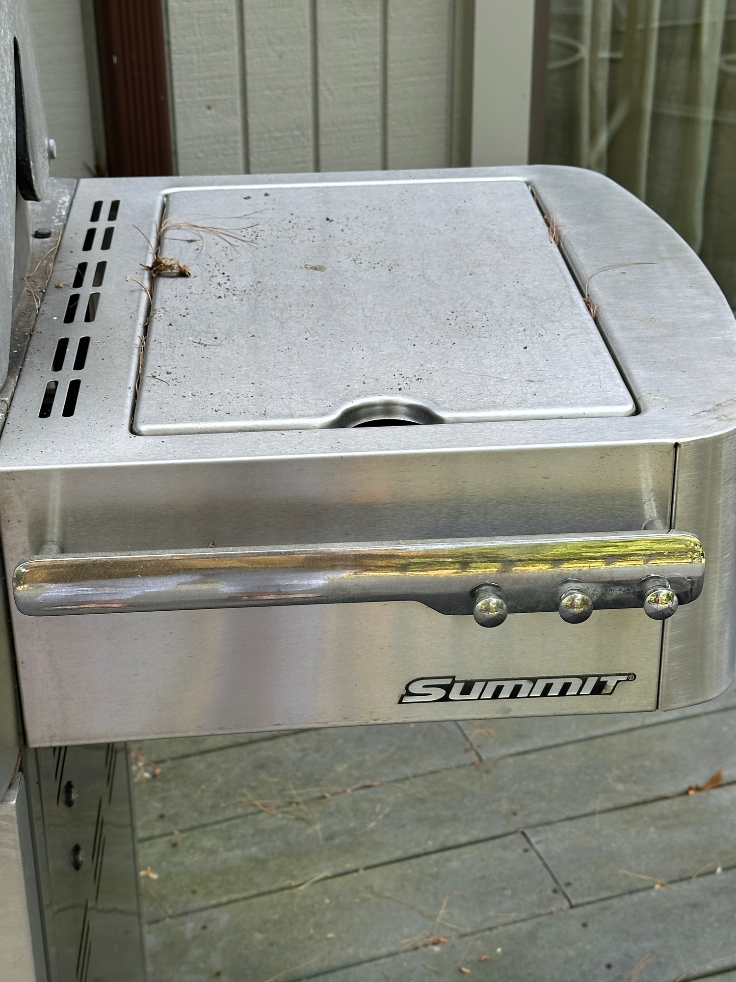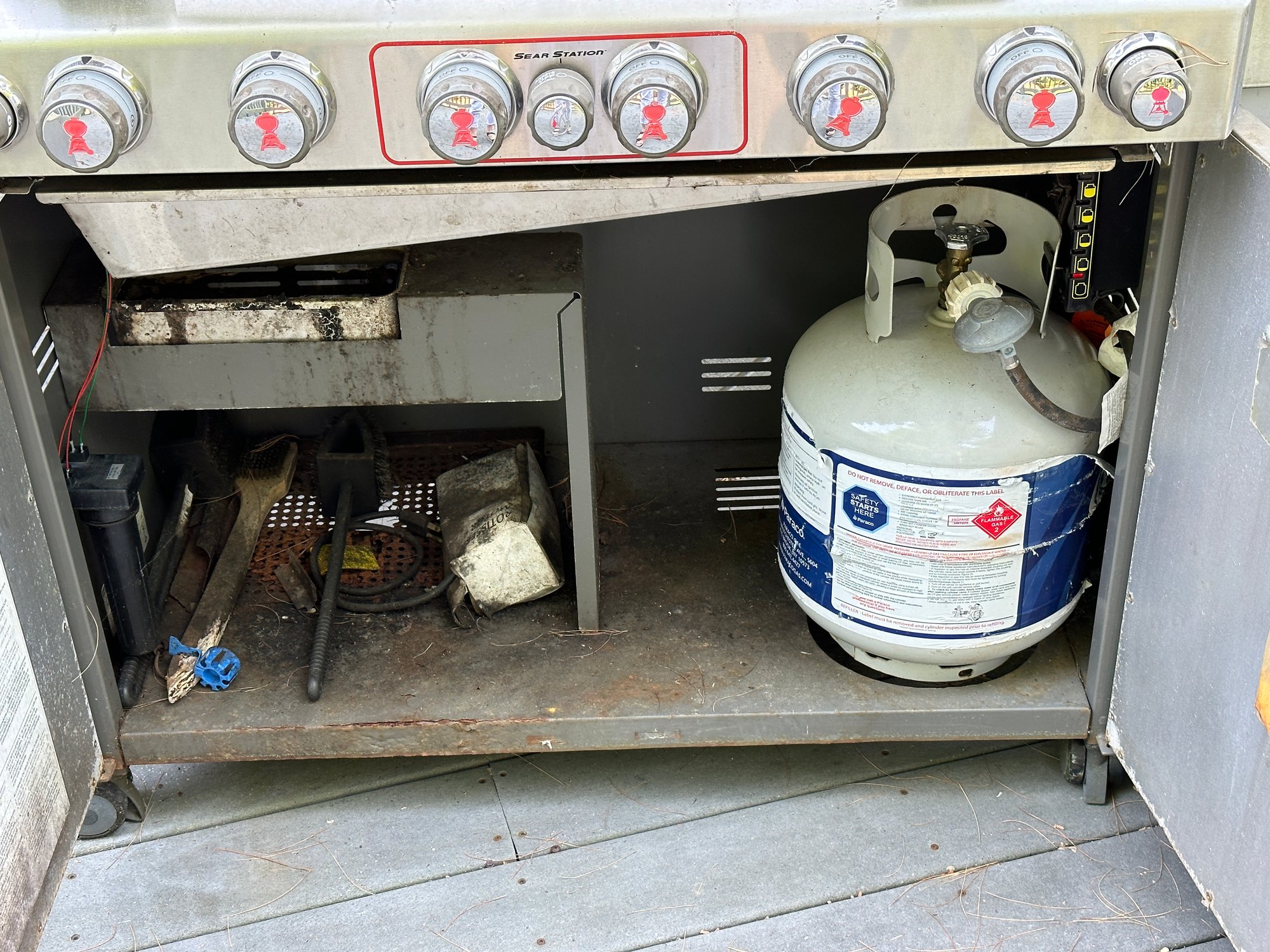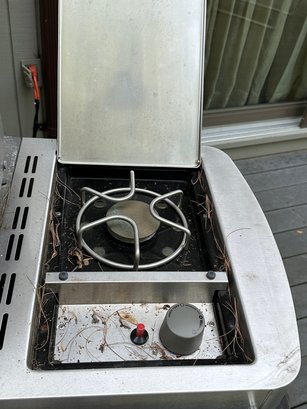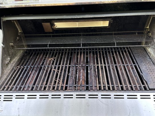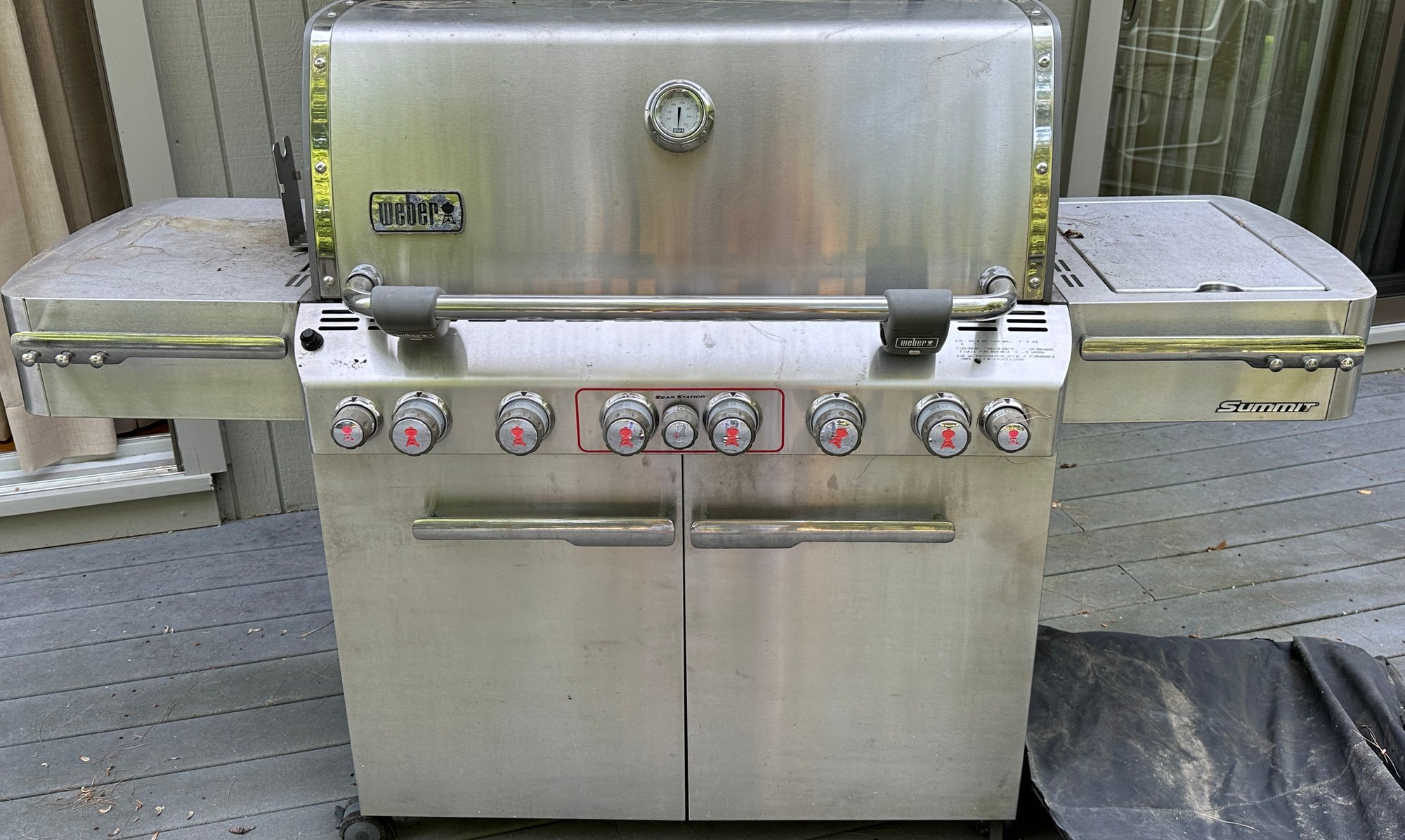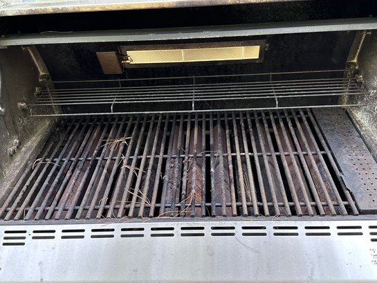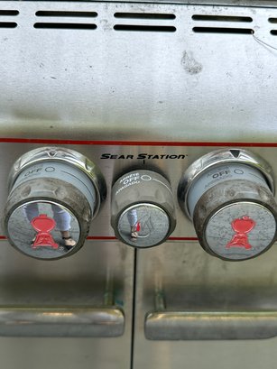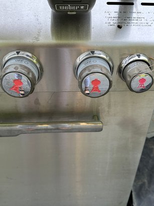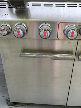 Weber Summit gas barbecue Grill in Good Condition, with right sided burner & tool holder, and includes the gas tank. There is a thermostat on the grill front& lights on the arm of the lid. The interior of the grill appears to be in good