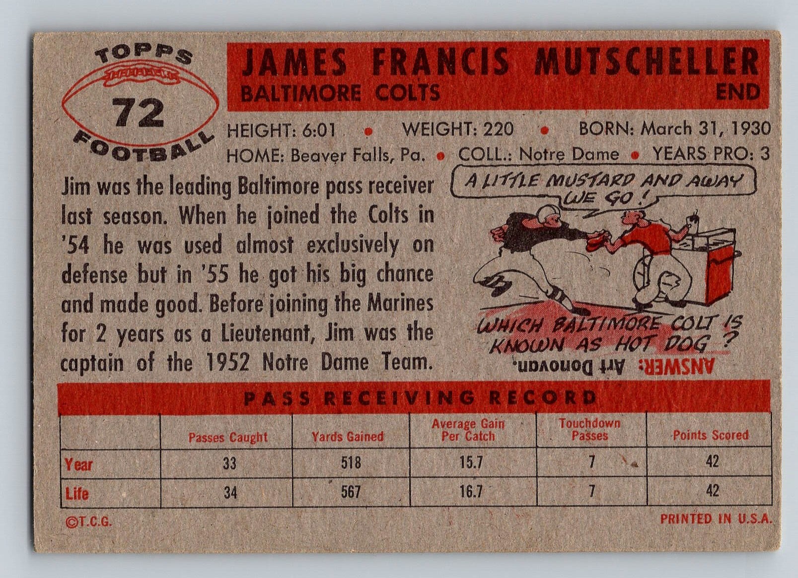 1956 TOPPS Jim Mutscheller Football Card - VG-EX