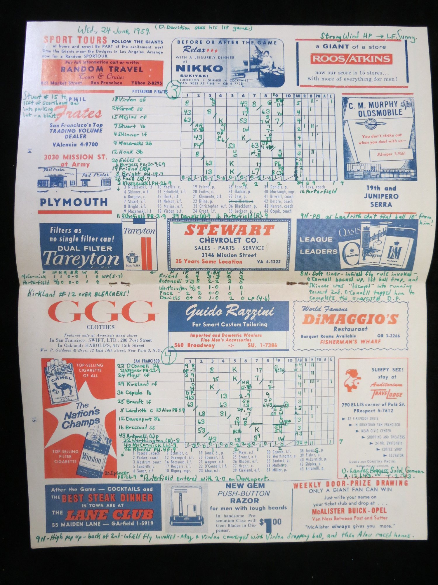 Willie Mays went 2 for 4. Neatly scored with extensive game notes on the score page and cover. VG