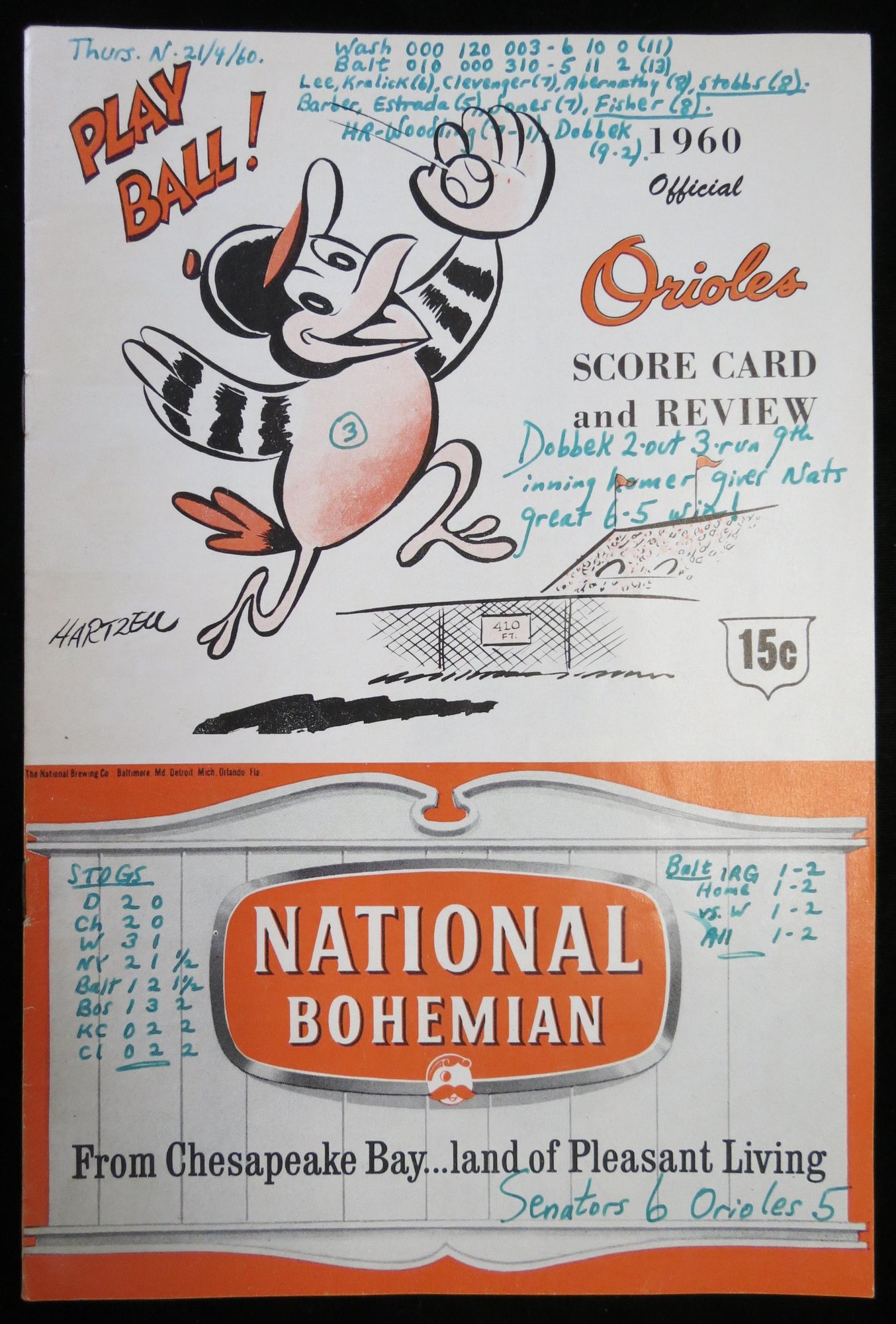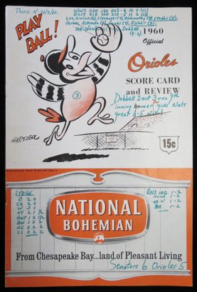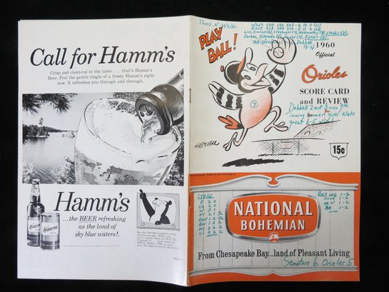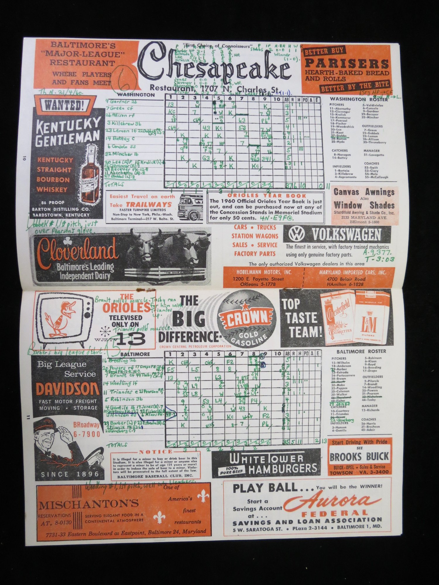 April 21, 1960, 3rd game of the season. Neatly scored with extensive game notes on the score page and cover. VG