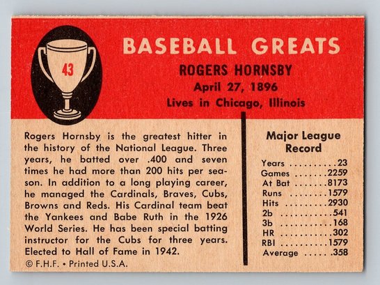 1961 FLEER Roger Hornsby Baseball Card - EX/MT To NM