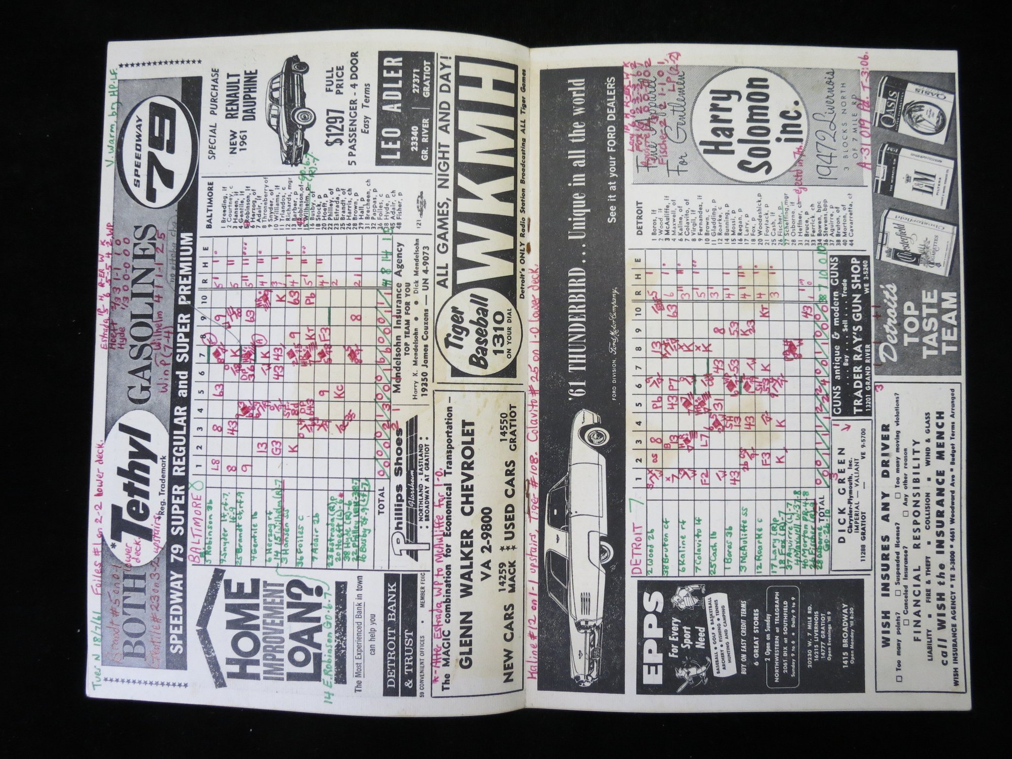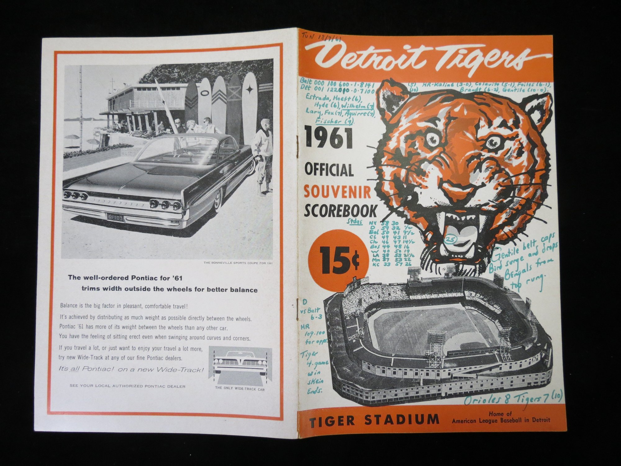 July 18, 1961. Neatly scored with extensive game notes on the score page and cover. VG