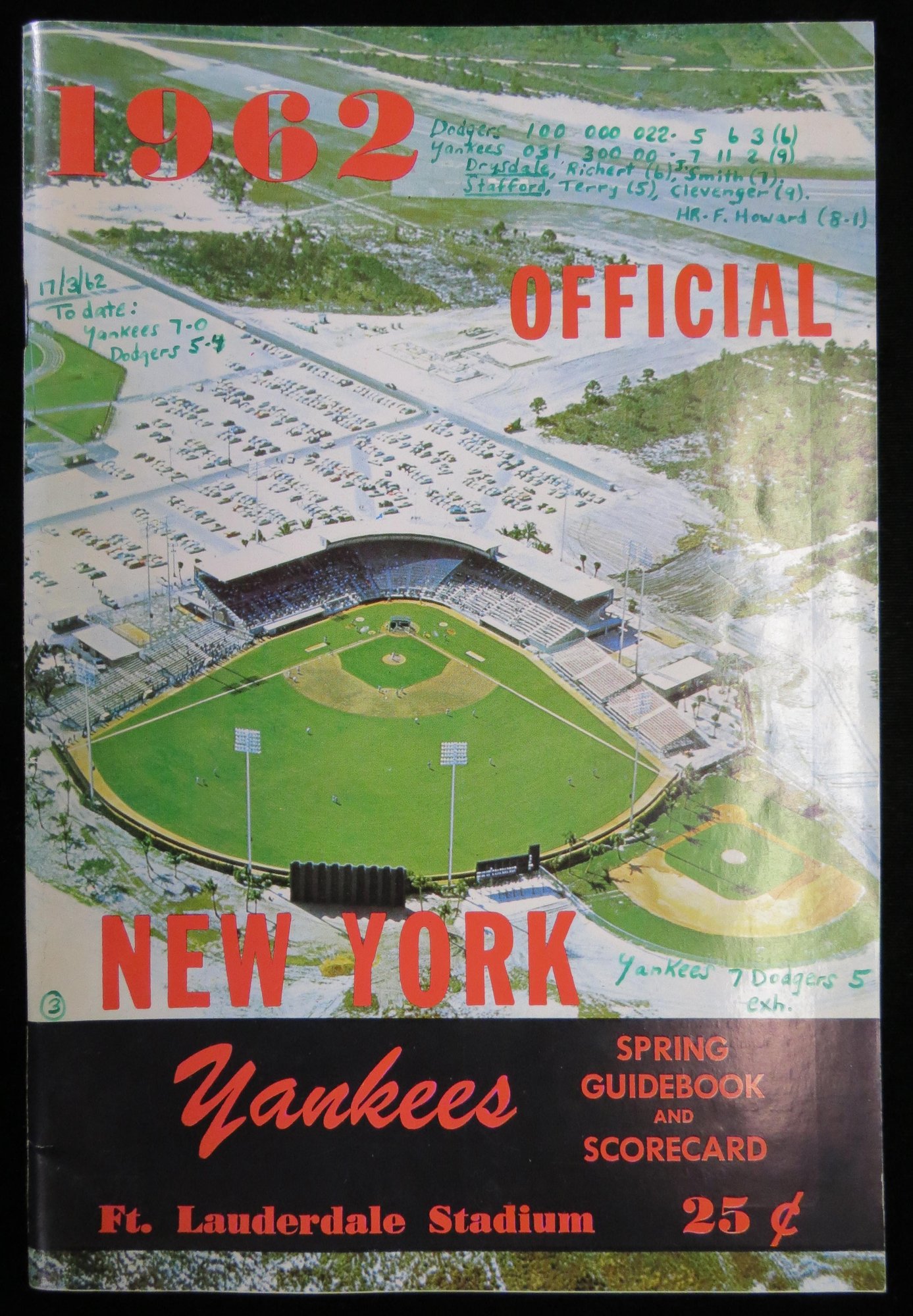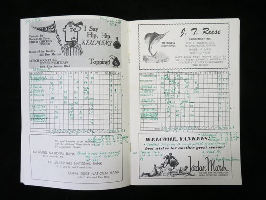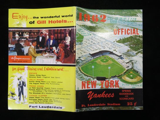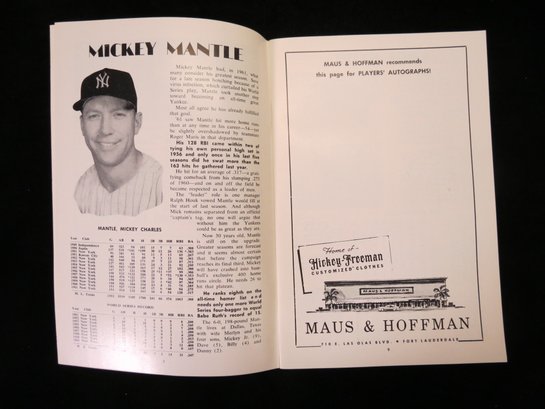 Early spring training program for March 17, 1962. This game was loaded with Hall of Famer, including Mickey Mantle, Yogi Berra, Duke Snider, Don Drysdale, as well as stars such as Roger Maris, Tommy Davis, Maury, Wells and More. The program is a whopping 57 pages and pictures each member of the Yankees team in yearbook format with biography and stats. Neatly scored with extensive game notes on the score page and cover. VG/EX