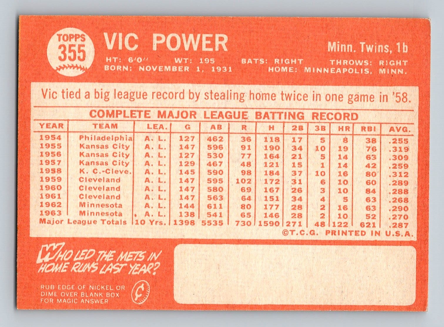 1964 TOPPS Vic Power Baseball Card - EX/MT