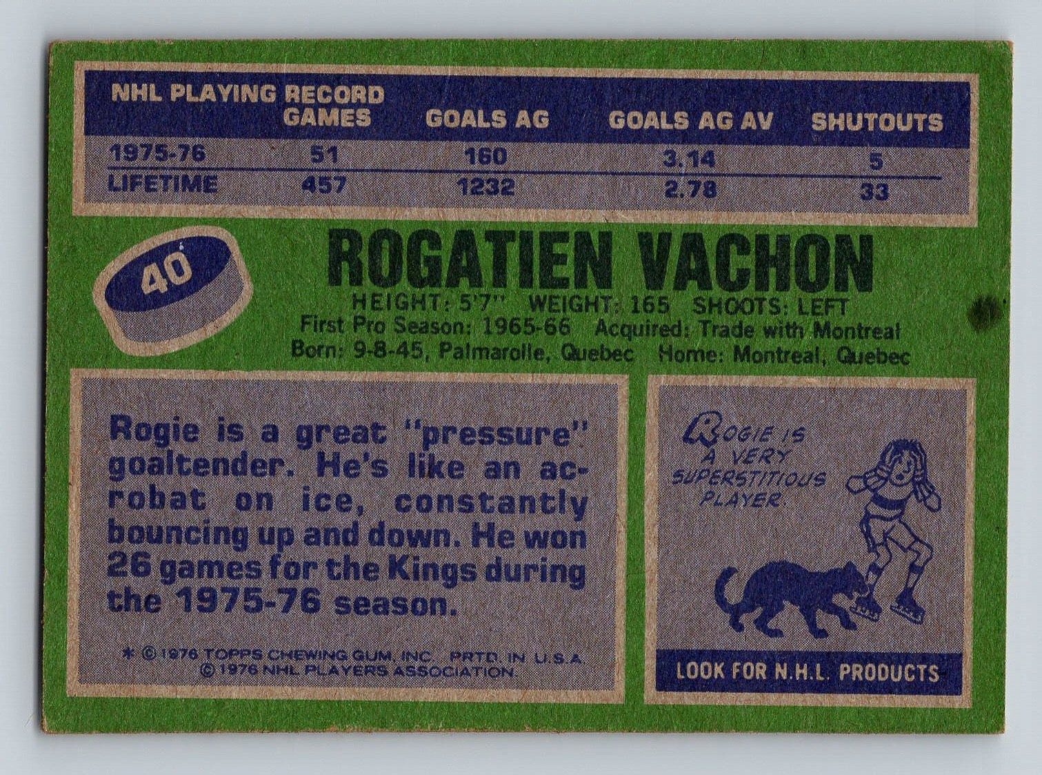 1976 TOPPS Rogatien Vachon Hockey Card - EX/MT