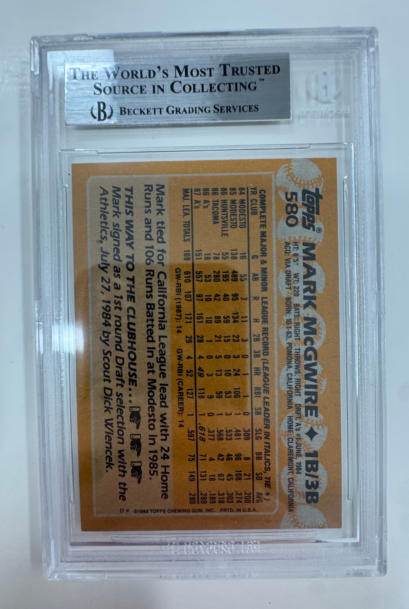 1988 Topps Mark McGwire Baseball Card Second Year Beckett 9 Mint