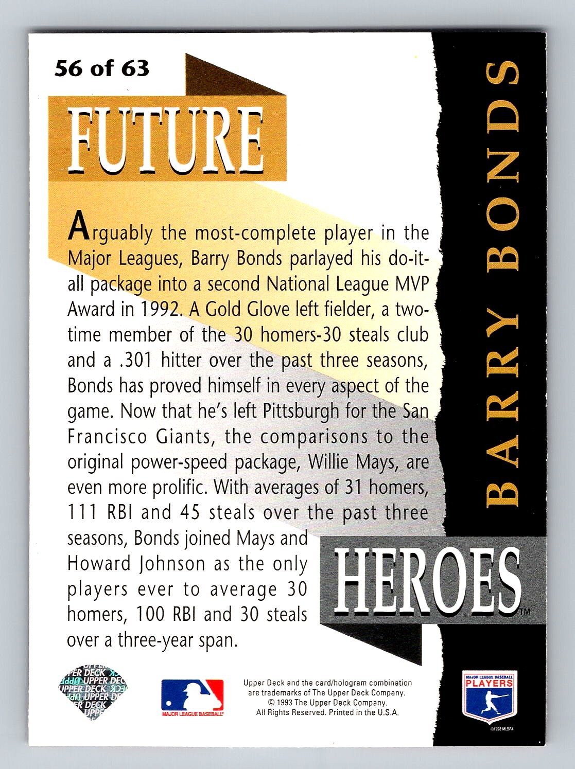 1993 Upper Deck Future Heroes Barry Bonds Insert Baseball Card - MINT