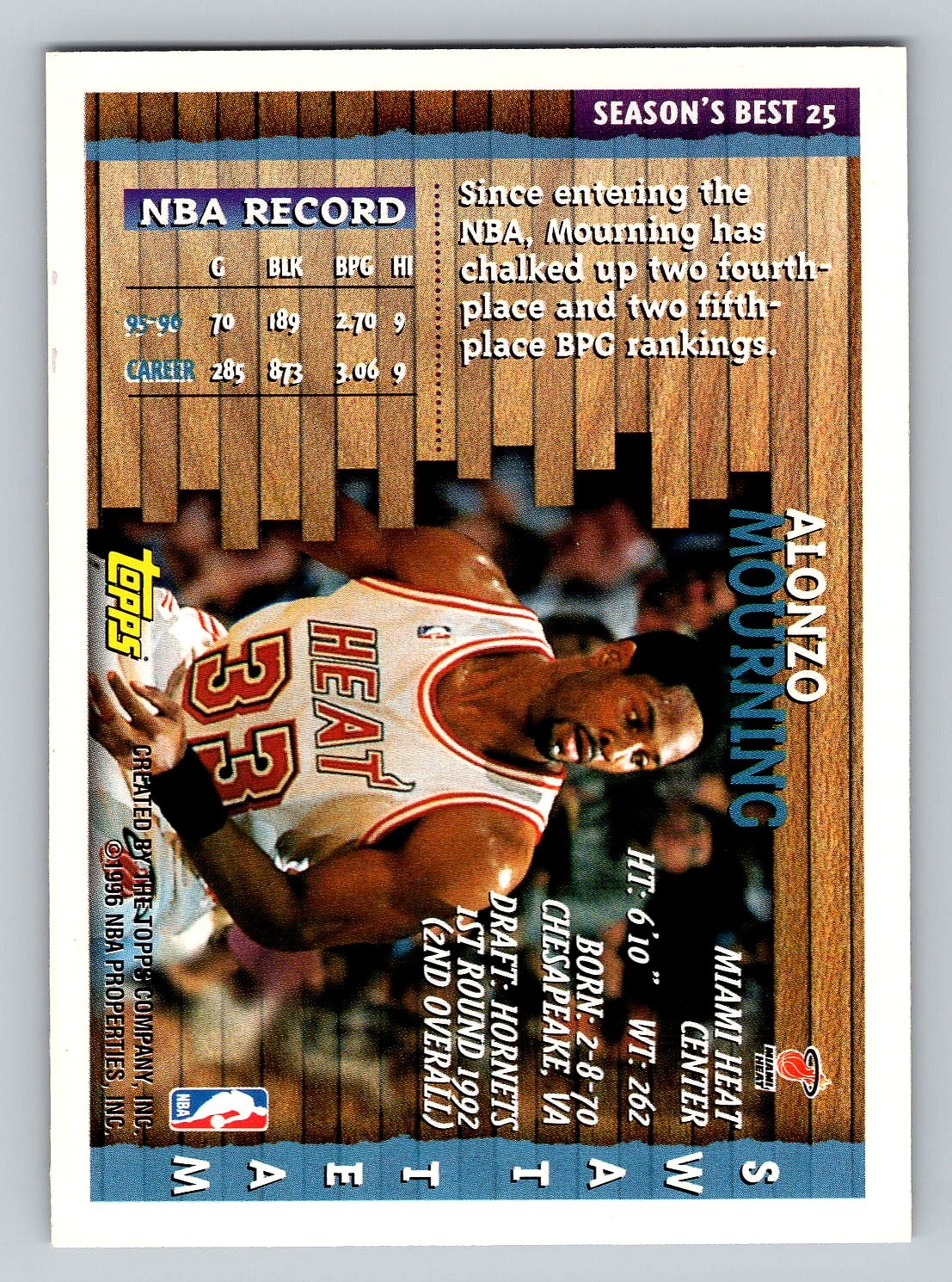 1996 Topps Season's Best Alonzo Mourning Insert Basketball Card - MINT