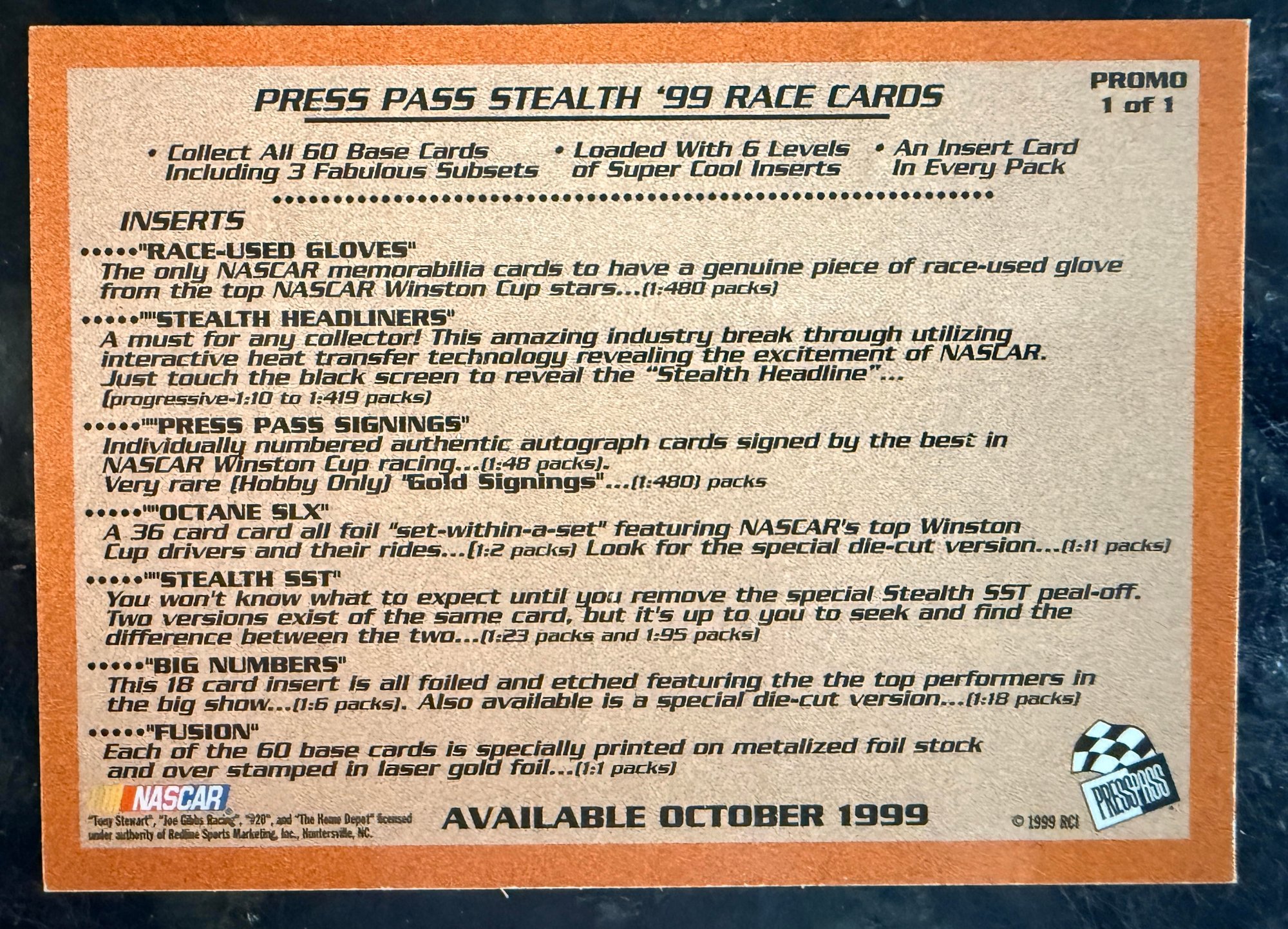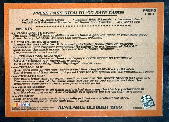 1999 Press Pass Stealth Tony Stewart PROMO SAMPLE Racing Card - MINT