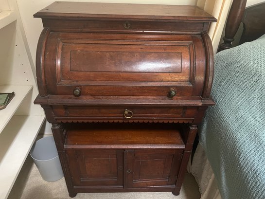 Lift the roll top and the desk moves forward. It has a stand that goes on top, however one of the pegs of the stand is broken off so it will require repair if you want to reattach it (or you can make a hanging shelf out of it). Original handles and pulls. 38.5" tall, 27" wide and 17" deep. Light to moderate general overall wear consistent with an almost 200 year old piece.