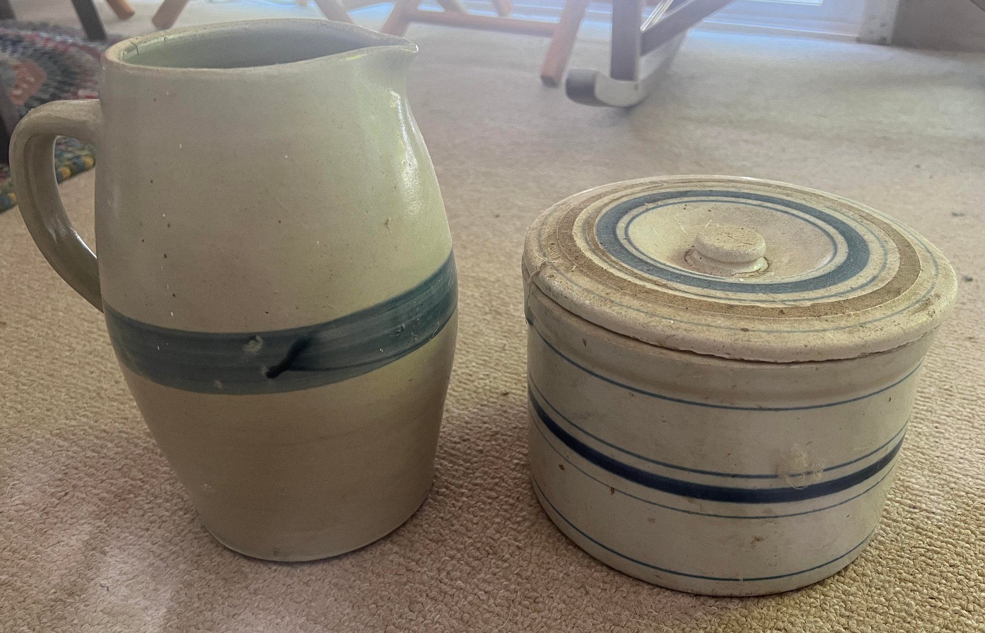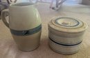 Pitcher is 9" tall, covered crock is 7.75" diameter. Minor edge and rim wear common on all these vintage piecs.